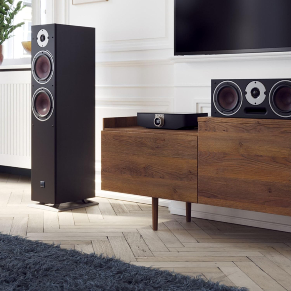 DALI Oberon 7 - старша модель серії, створена для потужного стереозвуку та домашнього кінотеатру. Оснащена двома 7-дюймовими НЧ-динаміками з дерево-паперовими дифузорами на гумових підвісах та технологією SMC для зменшення іскаження. Басовики працюють через фазоінвертор на задній панелі, використовуючи повний об'єм корпусу.