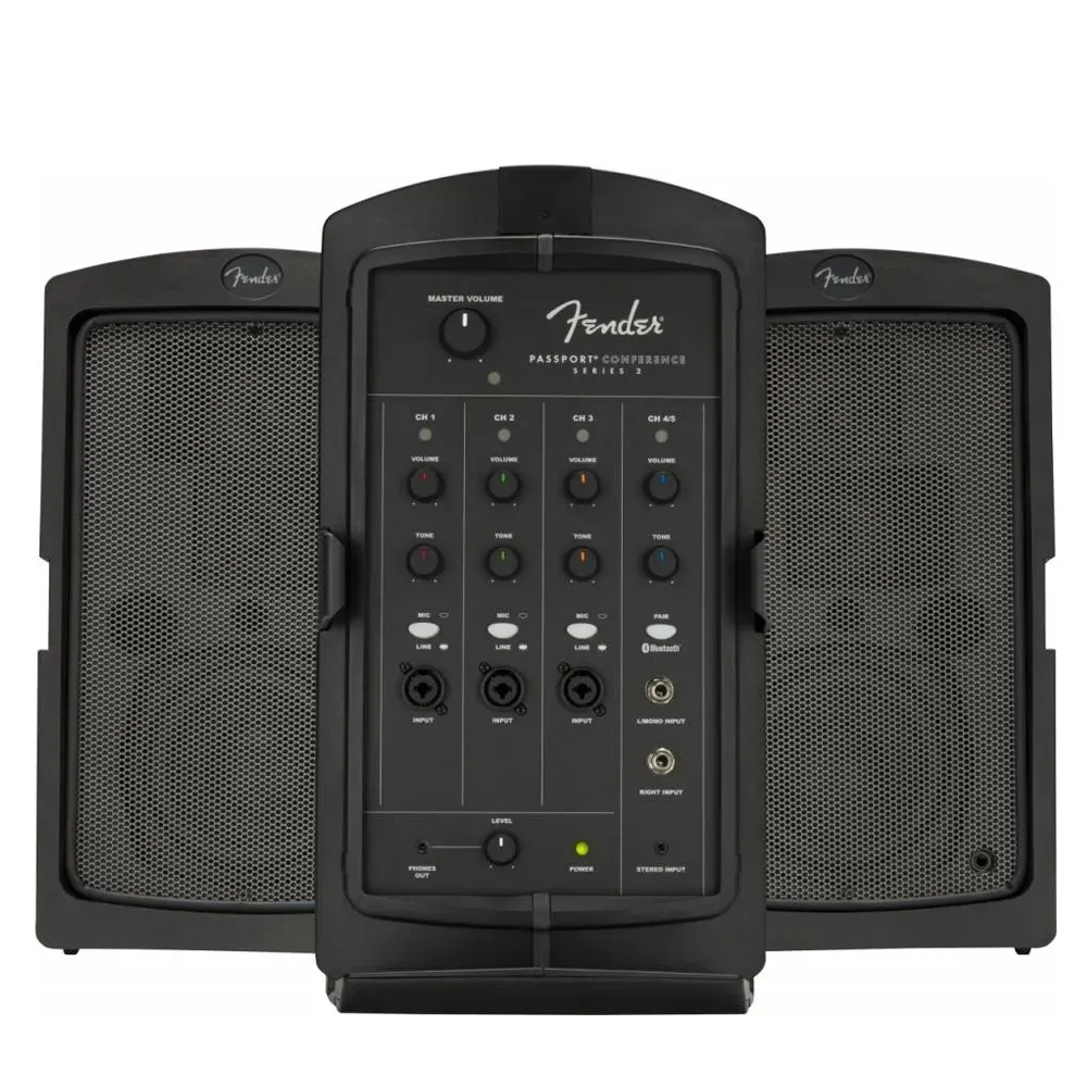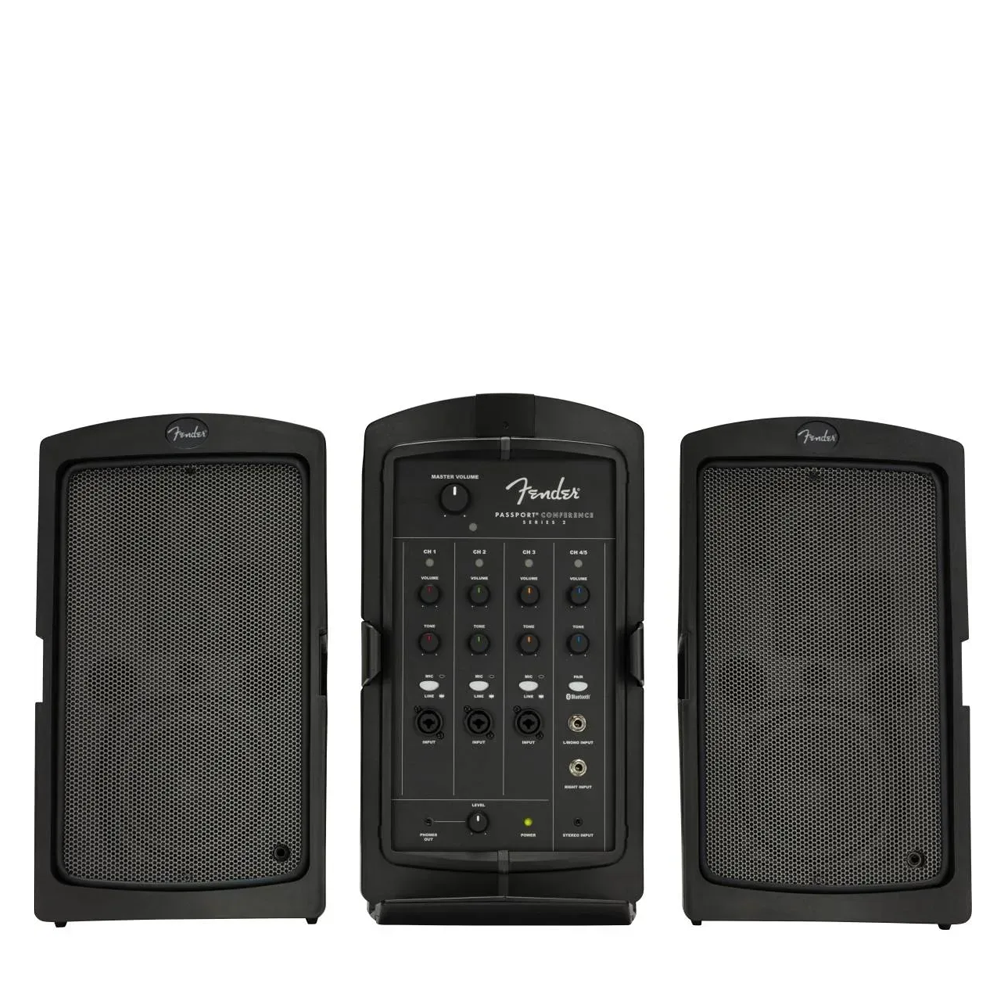 Fender Passport Conference Series 2 – Портативна all-in-one PA система Fender у форматі валізи для озвучення невеликих і середніх подій: 175 Вт Class-D, п’ятиканальний активний мікшер і повнодіапазонні колонки 2×5.25" з 4×2.75" поворотними ВЧ-твітерами для чіткого голосу та музики, 7 входів (3 комбіновані XLR/Jack 6.3 мм mic/line, стерео Jack 6.3 мм, стерео 3.5 мм, Bluetooth-аудіо), окремі гучність і тембр на кожному каналі, master volume, pad на каналах 1–3, лінійний стереовихід 3.5 мм з регулятором рівня, швидке підключення й зручний варіант для презентацій, навчання, заходів, богослужінь і невеликих музичних виступів.