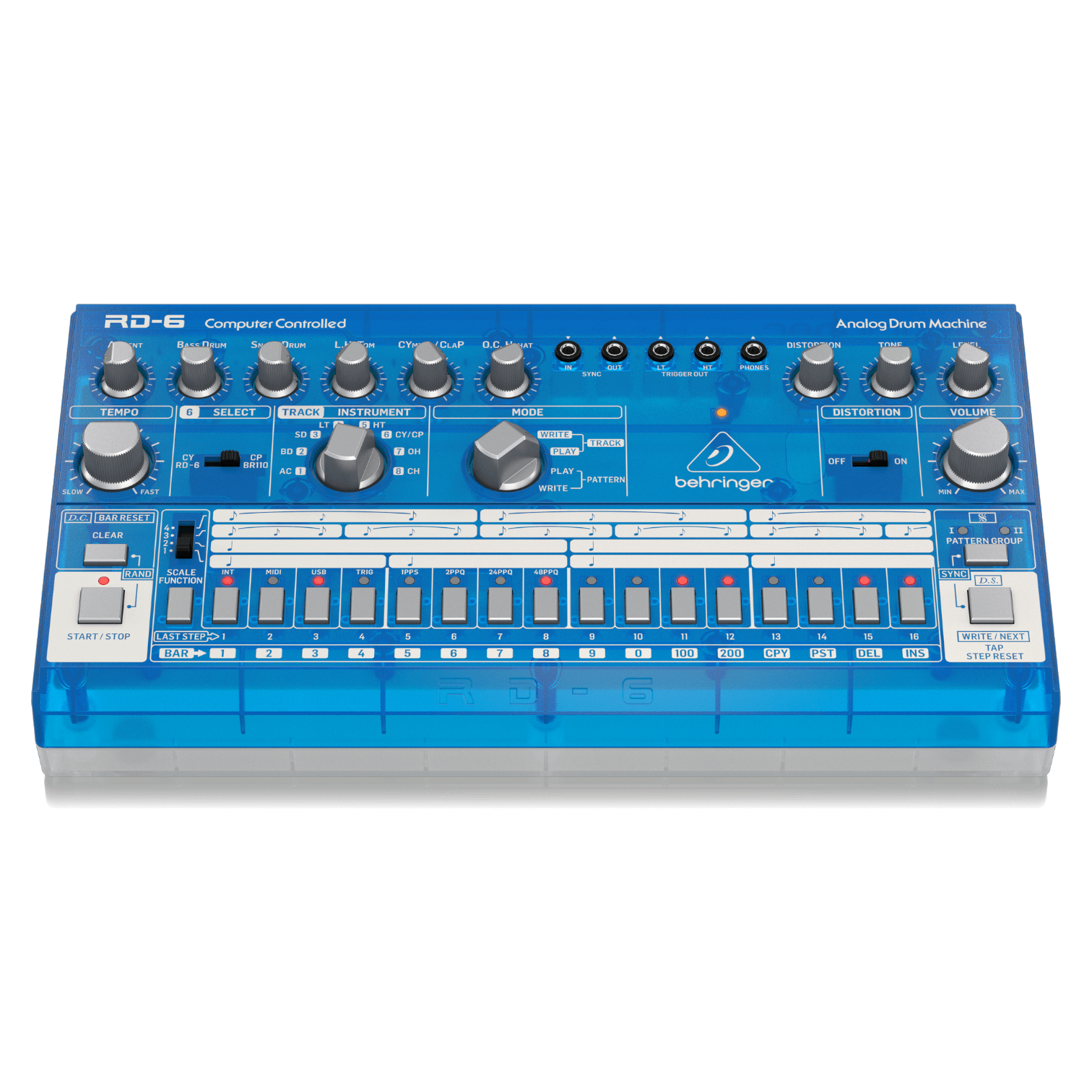 Behringer RD-6 – це аналогова драм-машина, яка поєднує класичний звук з сучасними можливостями. Вона є аутентичною реплікою легендарного Roland TR-606 і пропонує характерне звучання класичних барабанів. RD-6 оснащена восьмиканальною панеллю з окремою гучністю для кожного звуку: бас-барабан, снейр, низький та високий томи, тарілка/клаб, відкритий і закритий хай-хет.