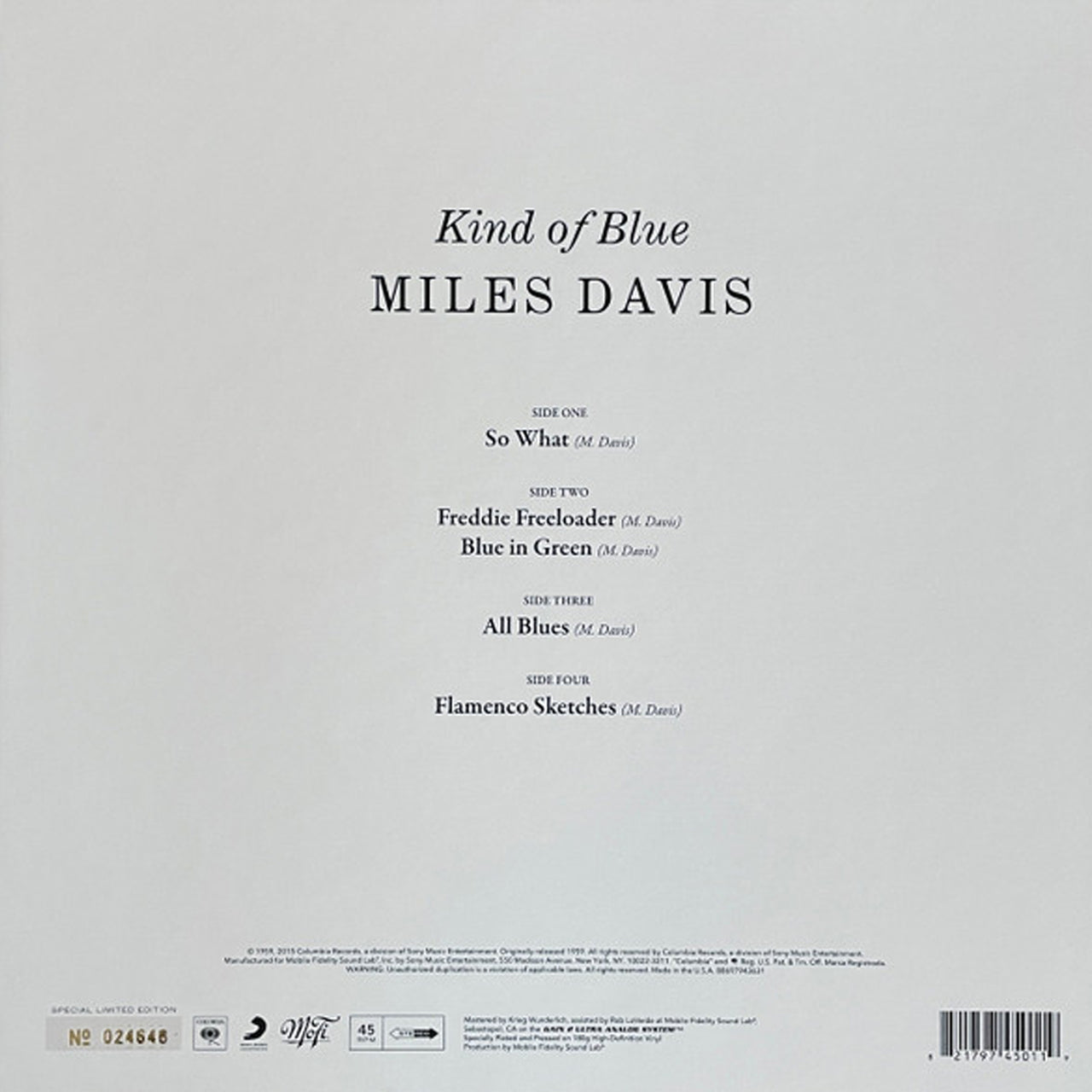 Miles Davis – Kind of Blue (Limited Edition) [2LP Box Set] — колекційне перевидання найвідомішого джазового альбому всіх часів. Записаний у 1959 році разом із Джоном Колтрейном, Білом Евансом, Кеннонболом Еддерлі, Полом Чемберсом і Джиммі Коббом, цей запис став еталоном модального джазу. «Kind of Blue» вражає спокоєм, чистотою звучання та винятковою взаємодією між музикантами, зберігаючи актуальність понад шість десятиліть.