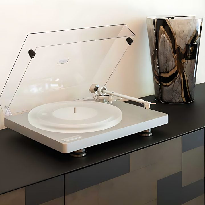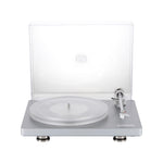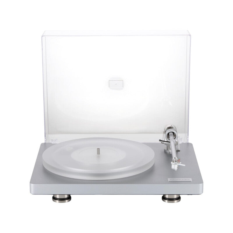 Акриловий опорний диск товщиною 20 мм працює в парі з алюмінієвим субдиском, виготовленим на верстатах із ЧПК. Використання полірованого сталевого шпинделя в бронзовій втулці з тефлоновим підп’ятником гарантує високу точність швидкості обертання. Це компактний, але безкомпромісний апарат для тих, хто хоче отримати фірмове звучання та надійність Clearaudio у більш лаконічному та зручному для налаштування форматі.