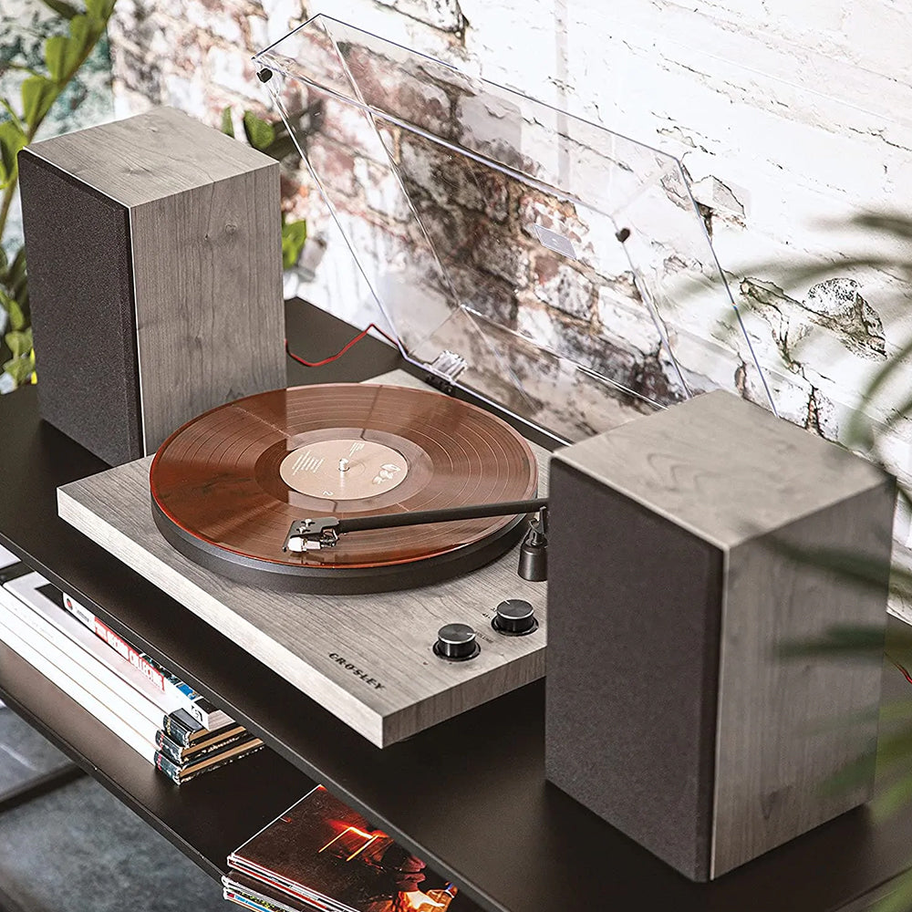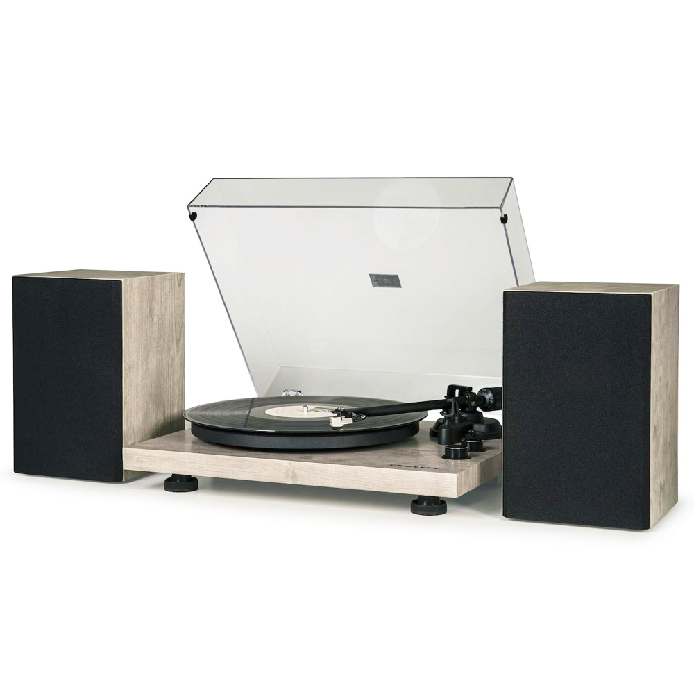 Crosley C62 — стильний програвач вінілу з вбудованим Bluetooth-приймачем, який дозволяє перетворити його на бездротову колонку для вашого смартфона. Цей двошвидкісний програвач (33 1/3 та 45 об/хв) має МДФ-цоколь з штучного горіха та сталевий диск для мінімізації вібрацій.