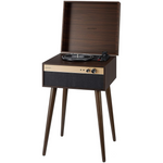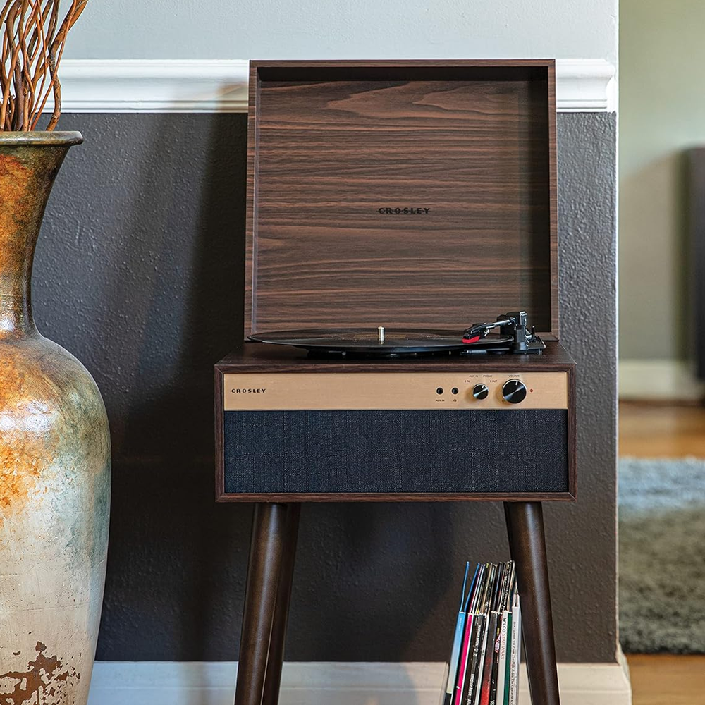 Це Джаспер. З витонченими звуженими ніжками та вишуканою атмосферою середини минулого століття, Jasper забезпечує ретро-дизайн із звуком і функціональністю, які є на 100% сучасними. Тришвидкісний програвач включає в себе всі навороти: вбудований приймач Bluetooth, роз'єм для навушників і допоміжний вхід. І те глибоке горіхове покриття з золотими акцентами? Чиста досконалість. Завдяки приголомшливому темному вигляду та кришталево чистому звуку за дивовижною ціною Jasper – це справді повний пакет.