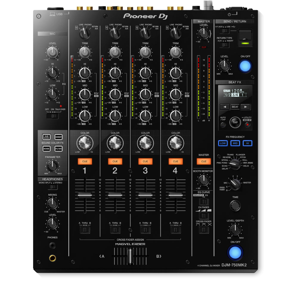 Pioneer DJM-750MK2 — це 4-канальний клубний мікшер із цифровим 64-бітним процесором. Він оснащений повним набором ефектів Beat FX і Sound Color FX, знайомих з флагманської моделі DJM-900NXS2, що дозволяє творити складні й динамічні мікси в реальному часі.