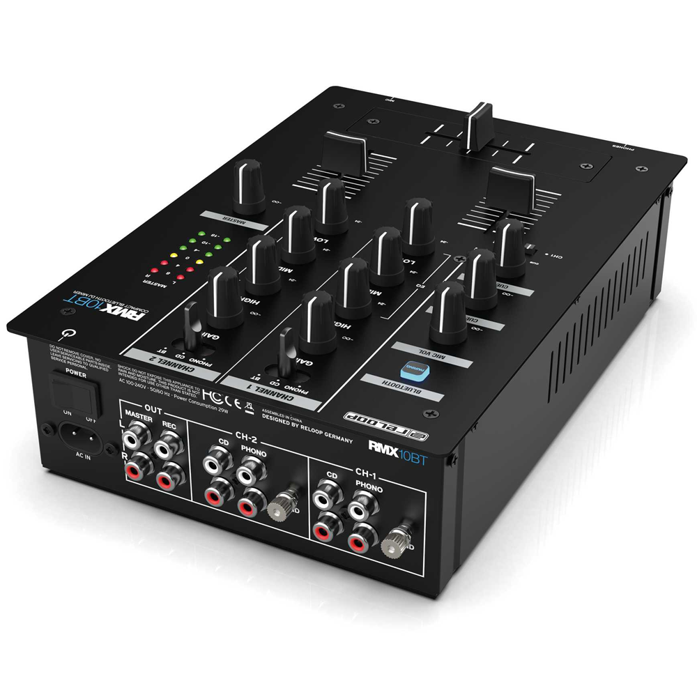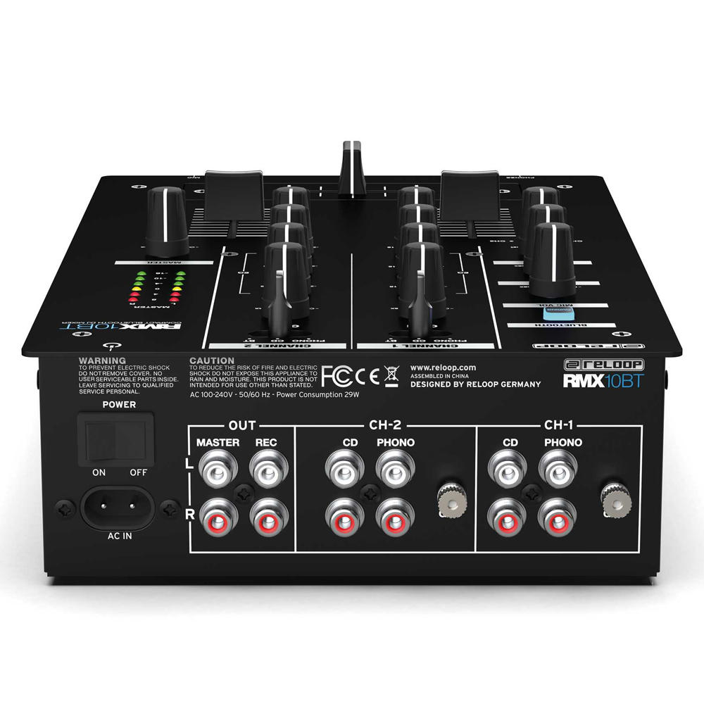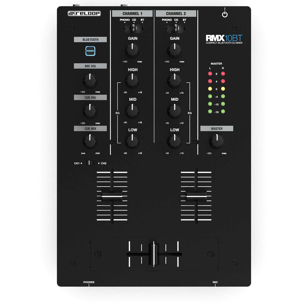 Reloop RMX-10 BT — це 2-канальний DJ-мікшер із вбудованим Bluetooth-модулем. Підключення через Bluetooth дозволяє здійснювати бездротовий стримінг зі смартфона або планшета безпосередньо на мікшер, що дає змогу використовувати мобільний пристрій як джерело відтворення. Сигнал Bluetooth може бути спрямований на обидва канали, а також мікшер підтримує роботу з кількома Bluetooth-джерелами одночасно.