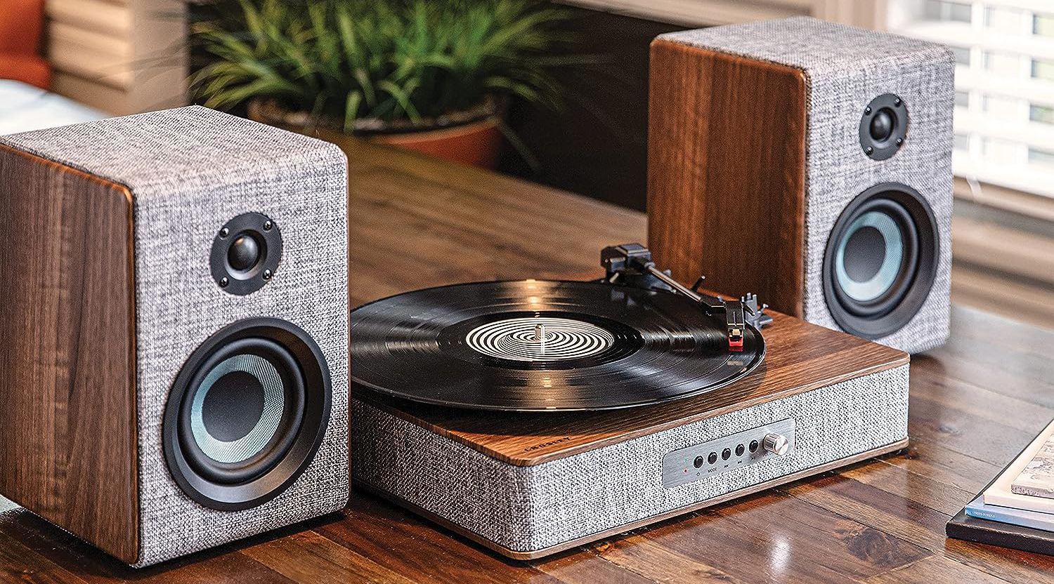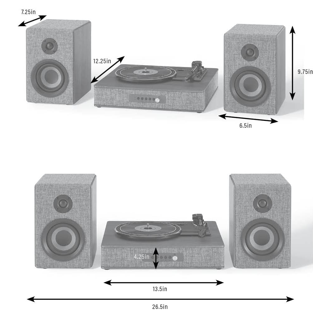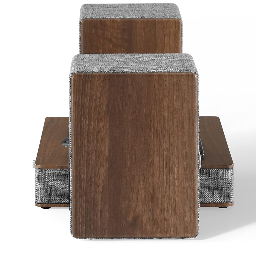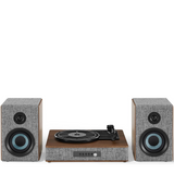 Ця стильна система в сірої тканині з дерев’яними елементами горіха і сріблястими акцентами не тільки гарно виглядає, а й звучить потужно: тришвидкісний програвач підтримує 33 1/3, 45 і 78 обертів на хвилину, оснащений голкою NP16, FM-радіо та додатковим входом. Потужність динаміків — 2х25 Вт.