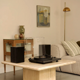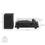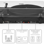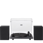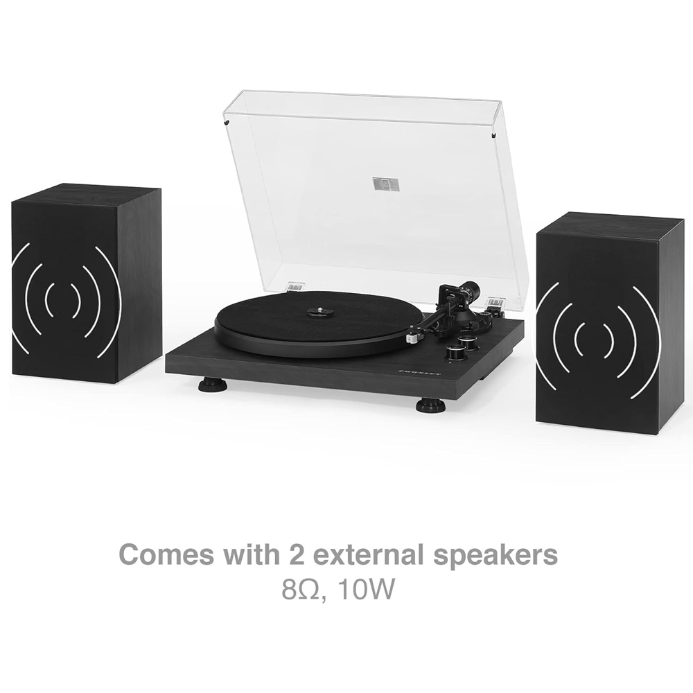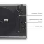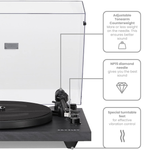 Програвач оснащений регульованим алюмінієвим тонармом, попередньо встановленим картриджем з рухомим магнітом та можливістю оновлення. До комплекту входять динаміки з середньочастотним динаміком і твітерами для кращого звучання. Просте керування через дві ручки дозволяє змінювати швидкість, гучність та включати Bluetooth для трансляції музики.
