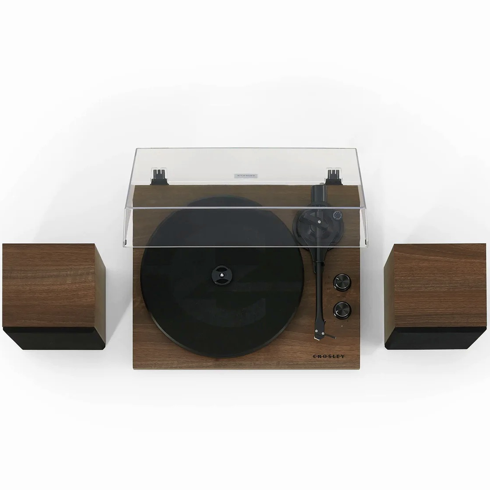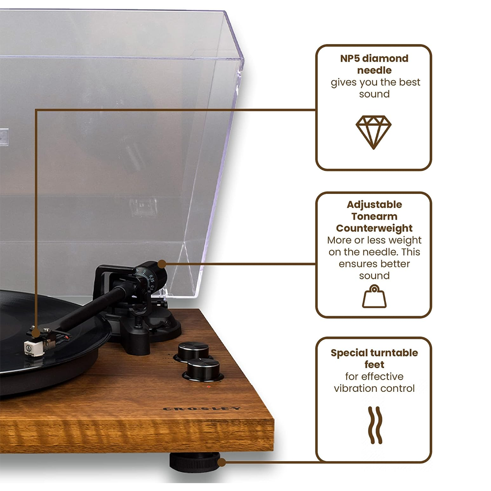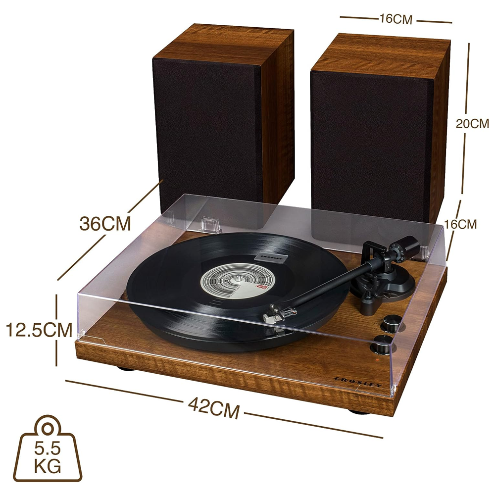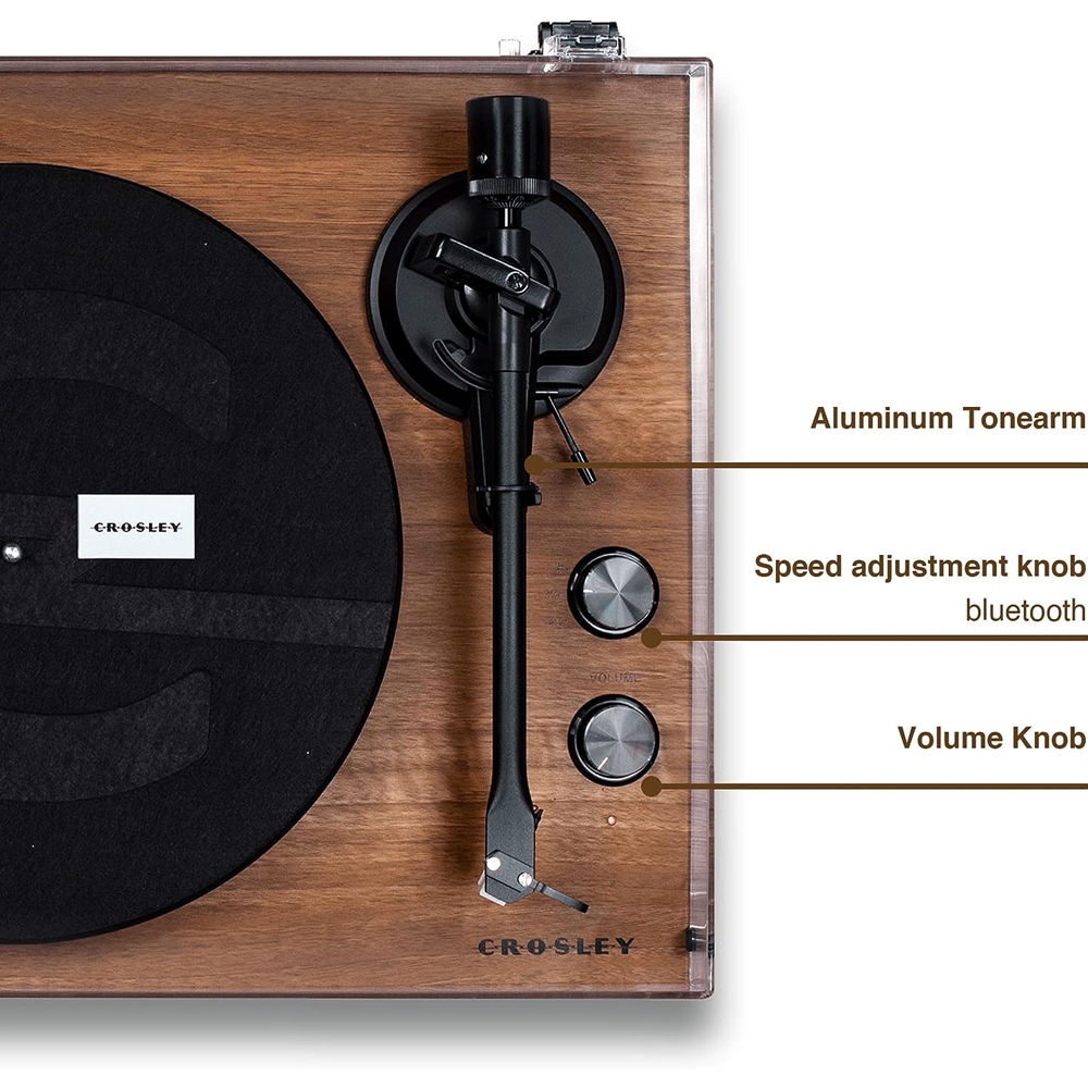 Crosley C62 — стильний програвач вінілу з вбудованим Bluetooth-приймачем, який дозволяє перетворити його на бездротову колонку для вашого смартфона. Цей двошвидкісний програвач (33 1/3 та 45 об/хв) має МДФ-цоколь з штучного горіха та сталевий диск для мінімізації вібрацій.