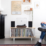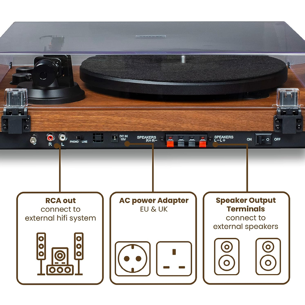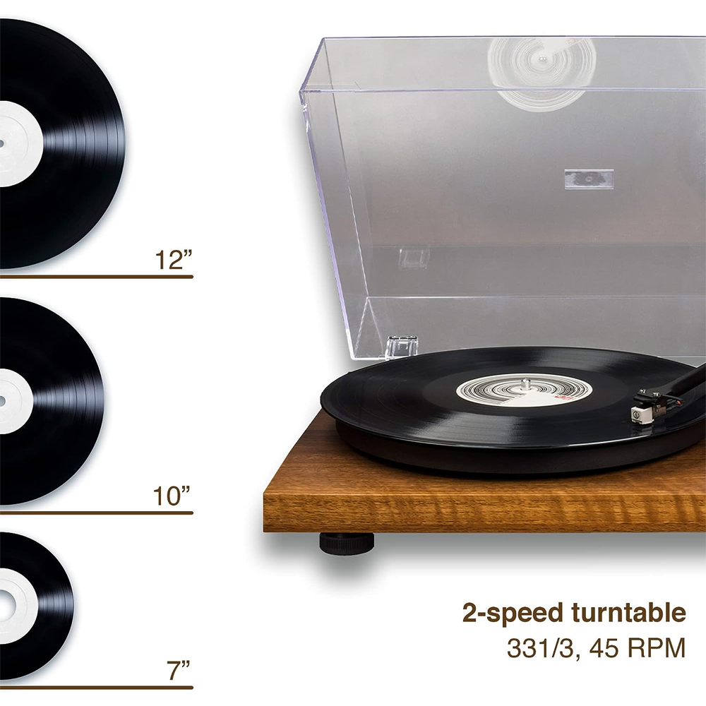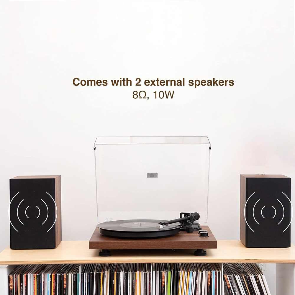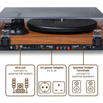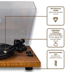 Програвач оснащений регульованим алюмінієвим тонармом, попередньо встановленим картриджем з рухомим магнітом та можливістю оновлення. До комплекту входять динаміки з середньочастотним динаміком і твітерами для кращого звучання. Просте керування через дві ручки дозволяє змінювати швидкість, гучність та включати Bluetooth для трансляції музики.
