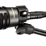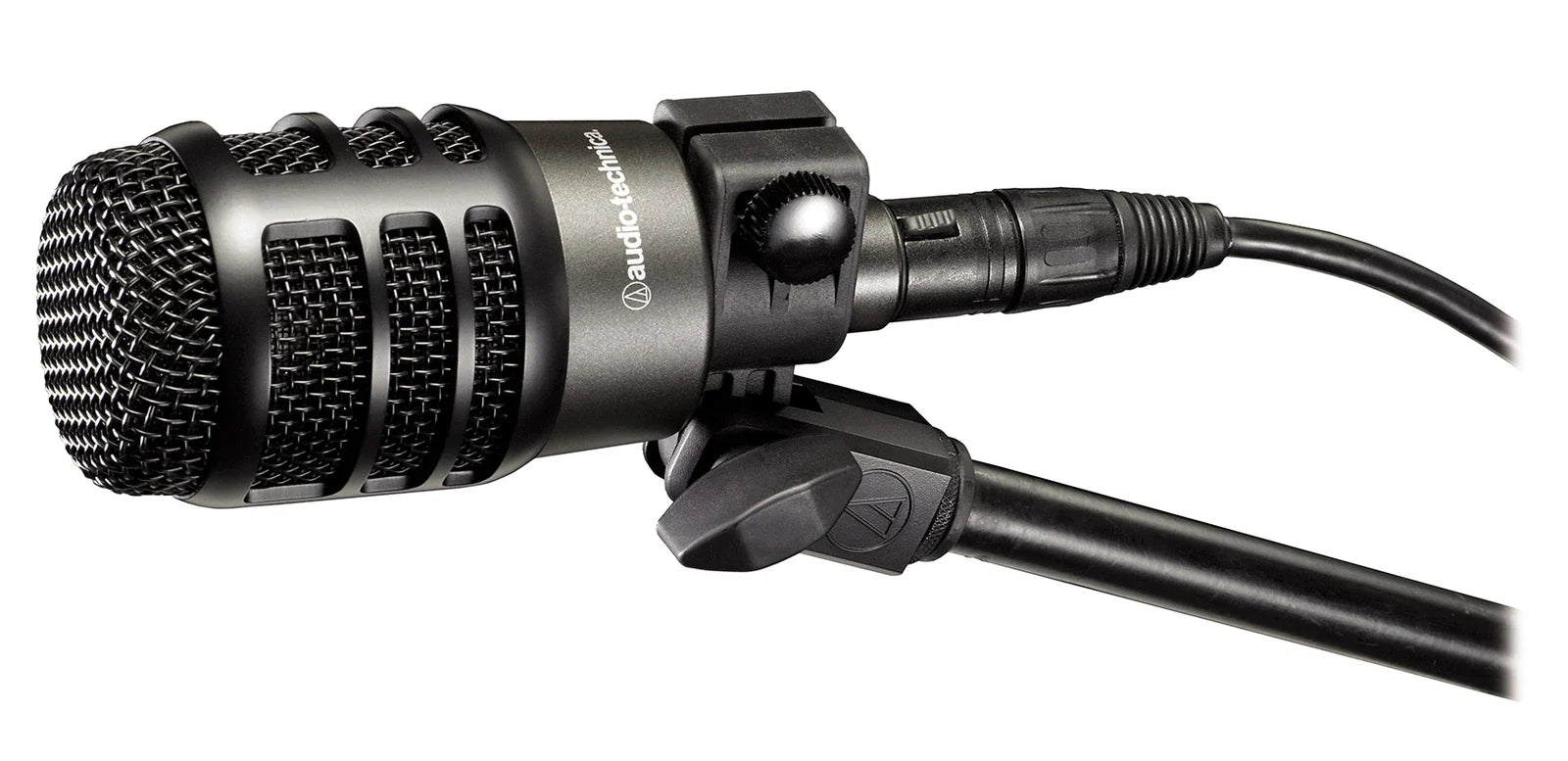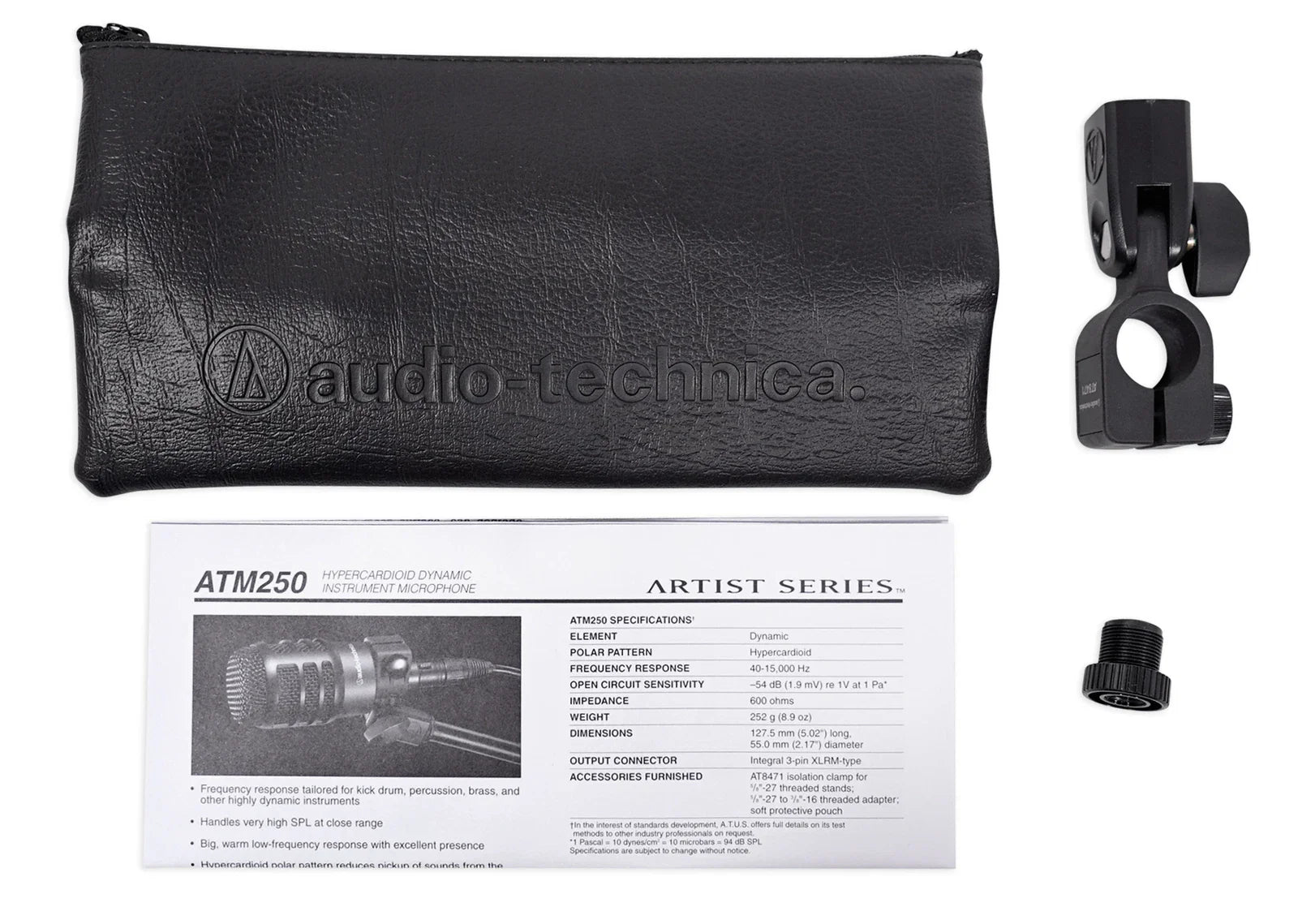 Audio-Technica ATM250 — це інструментальний мікрофон, розроблений спеціально для запису бочки, але також чудово підходить для томів та малого барабана. Його унікальність полягає в тому, що він поєднує дві капсули в одному корпусі: кардіоїдну конденсаторну та гіперкардіоїдну динамічну.