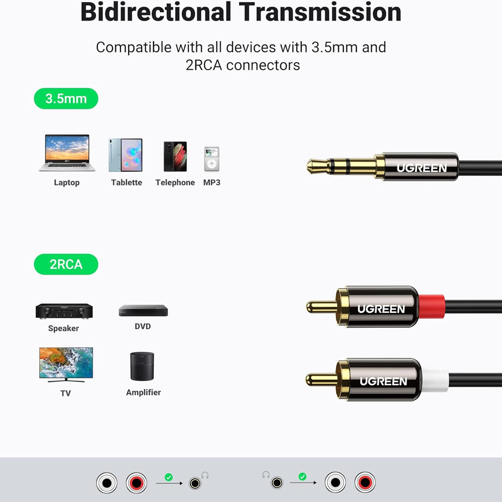 UGREEN 3.5 мм – 2 RCA аудіокабель підходить для підключення смартфонів, планшетів, ноутбуків до підсилювачів, колонок і домашніх аудіосистем.