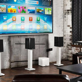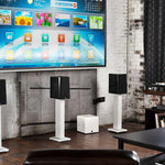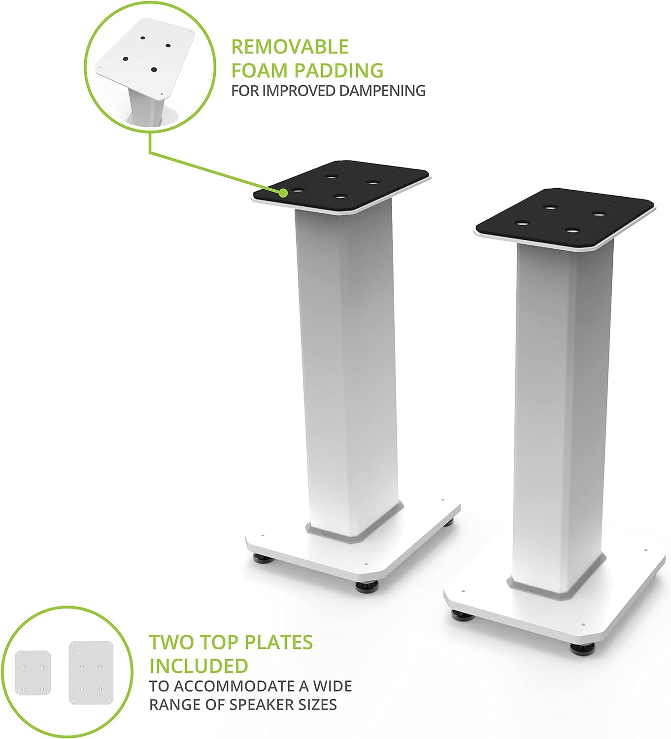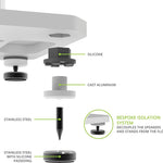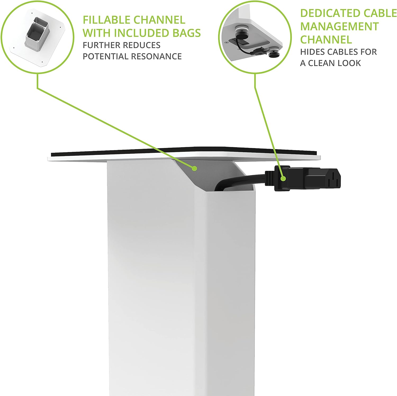 Кожна підставка витримує до 18 кг, а заповнюваний корпус і піна для демпфування знижують вібрації та резонанси, покращуючи фокусування звуку та деталізацію басів і високих частот. Дизайн включає кабельний канал для акуратного прокладання дротів і гумові ніжки або металеві шипи для стабільності на будь-якій поверхні.