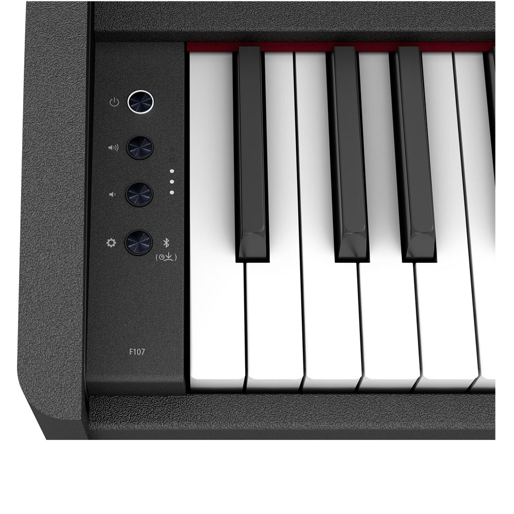 F107BKX — це не просто піаніно, а сучасний навчальний інструмент. Його ультратонкий дизайн у чорному кольорі займає мінімум місця. Клавіатура підтримує Bluetooth Audio та MIDI, що дозволяє легко підключатися до фірмових навчальних додатків Roland та грати під музику зі смартфонів. Простота керування та надійні вбудовані динаміки роблять F107BKX найкращим вибором для тих, хто шукає функціональність і стиль, не переплачуючи.