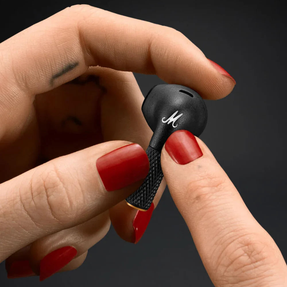 Marshall Minor IV Black — компактні повністю бездротові навушники, які здатні здивувати якістю звуку. Бас насичений і глибокий, середні частоти виразні, а високі прозорі і детальні, що робить музику живою та об’ємною навіть у маленькому форм-факторі.