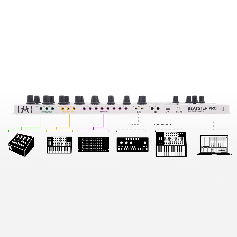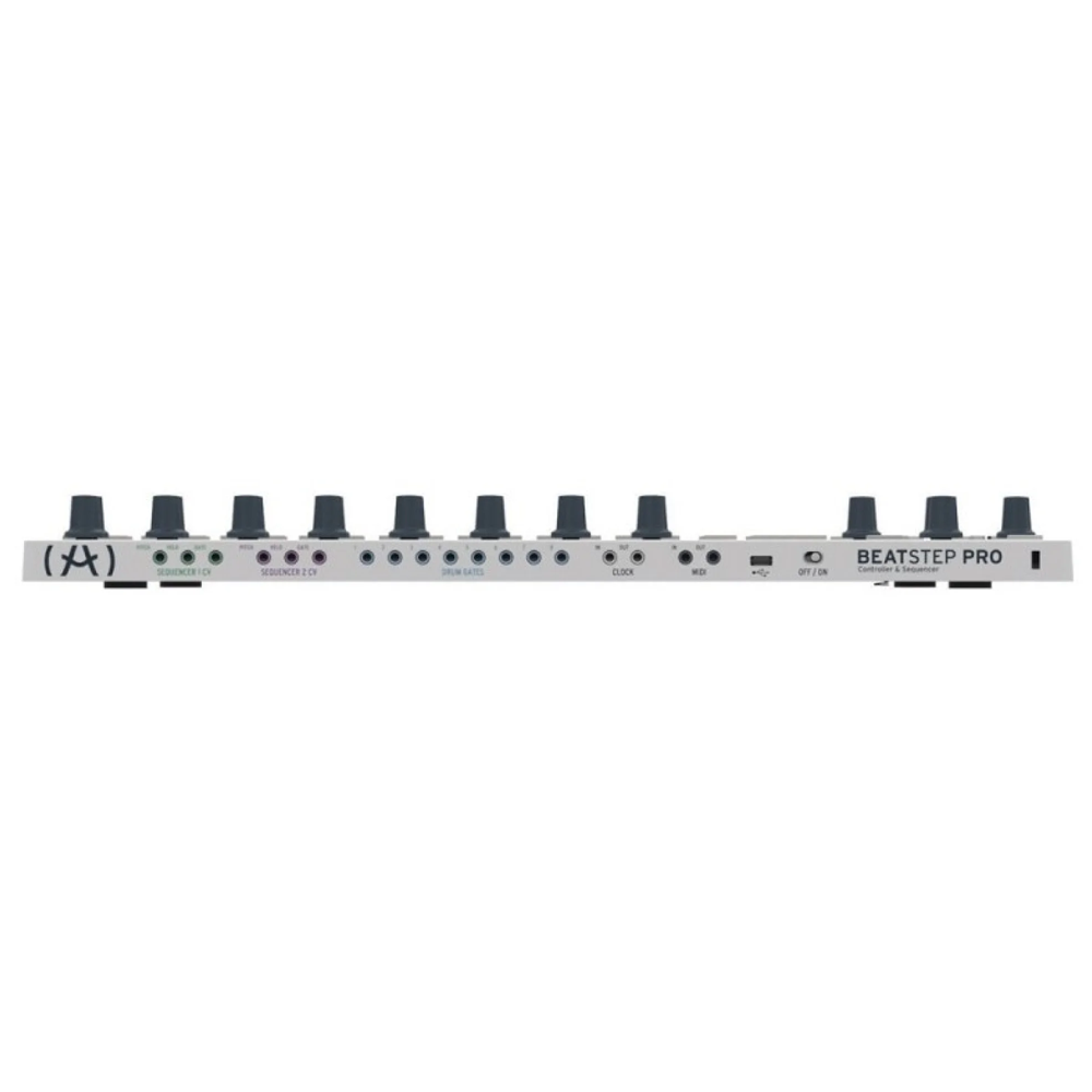 Arturia BeatStep Pro — унікальний контролер, секвенсор і композиційний інструмент в одному пристрої. Два незалежні мелодик-секвенсори та один драм-секвенсор надають можливості реалізації тисячі ваших ідей. Кожен мелодик-секвенсор дає змогу записати до 64 кроків з індивідуальними параметрами пітчу, швидкості натискання і тривалості нот. Секвенсор ударних має 16 окремих доріжок. BeatStep Pro має безліч MIDI-ефектів для створення чудових виступів. Режим контролера дає змогу запускати доріжки і керувати параметрами віртуальних інструментів у вашій улюбленій DAW. Можливий запис у реальному часі під час використання педів і кнопок, які використовуються для активації класичного барабанного обладнання під час відтворення. Функції управління роблять доступним запуск кліпів з обраної робочої станції. До BeatStep Pro можна підключити практично будь-який пристрій: комп'ютери, віртуальні інструменти, модульні синтезатори, драм-машини - все, що має USB, MIDI, CV/Gate, Clock або DIN синхронізацію.