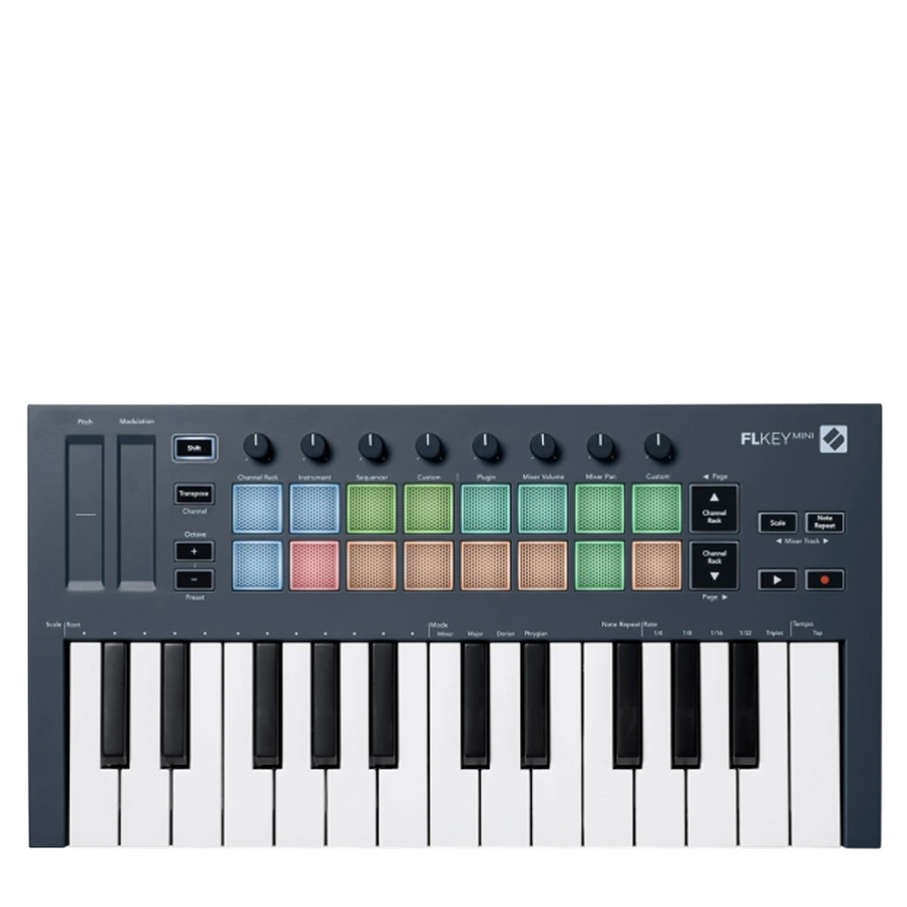 Novation FLkey Mini — компактна клавіатура для створення музики у FL Studio, що забезпечує швидке керування плагінами, секвенсором і основними функціями DAW. Невеликий формат і міні-клавіші роблять її зручною для мобільних студій і роботи в дорозі.