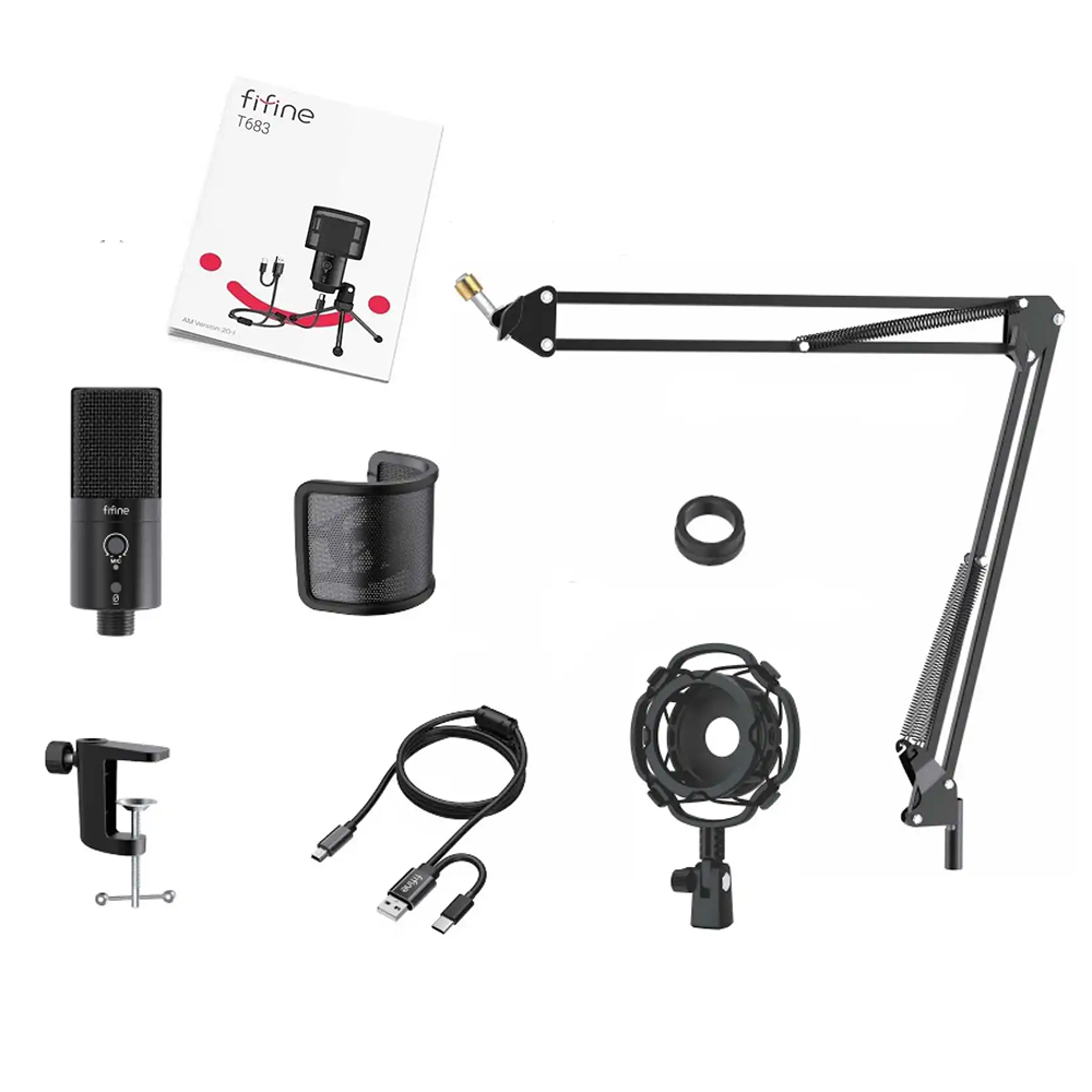 FIFINE T683 — це комплектний USB мікрофон, створений для стрімерів, блогерів та онлайн-спілкування. У комплекті вже є все необхідне: пантограф (бум-стійка), антивібраційне кріплення, поп-фільтр, кабель USB, адаптери та кріплення для столу. Пристрій підключається просто: USB (Type-A / Type-C) — і готовий до роботи без потреби у драйверах.