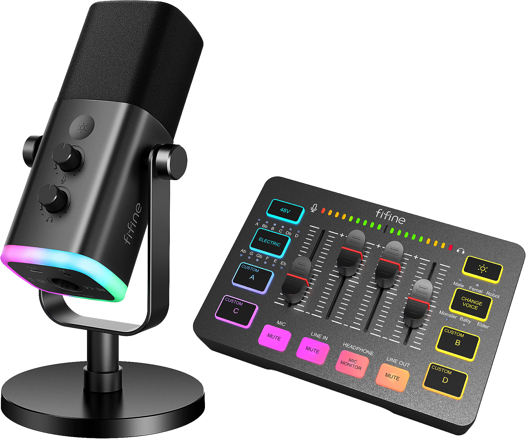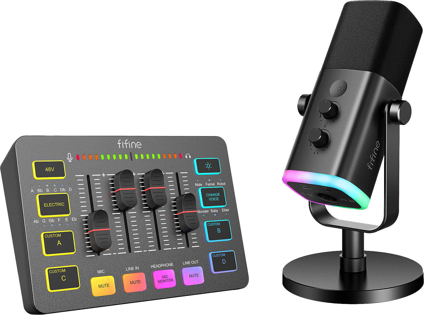 FIFINE KS5 — комплект для тих, хто хоче одразу зібрати нормальний голосовий сетап для стрімінгу, подкастів, ігор або онлайн-спілкування без окремого підбору всіх елементів. У наборі зібрано мікрофон, мікшер і кабелі для підключення, тому модель добре підходить як готова база для домашнього робочого місця, де важливі зрозуміле керування, акуратна організація підключення і швидкий старт без зайвого клопоту.