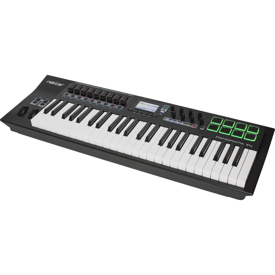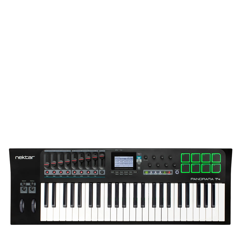 Nektar Panorama T4 — це професійна 49-клавішна клавіатура (з клавішами) для музикантів і продюсерів, що поєднує глибоку інтеграцію з DAW, повноцінний контроль плагінів і розширені можливості керування. Оснащена повнорозмірними клавішами з синтезаторною механікою, чутливими до сили натискання та післядотику, Panorama T4 забезпечує точну динаміку виконання. У конструкції передбачено 9 фейдерів, 8 педів із чутливістю до сили натискання та тиску, 8 призначуваних енкодерів і LED-кнопки для миттєвого керування плагінами, параметрами мікшера чи секвенсора. Великий LCD-дисплей із роздільною здатністю 128×64 пікселів спрощує навігацію та редагування, а колеса Pitch Bend і Modulation, а також кнопки Key Repeat і Pad Repeat додають виразності при грі.