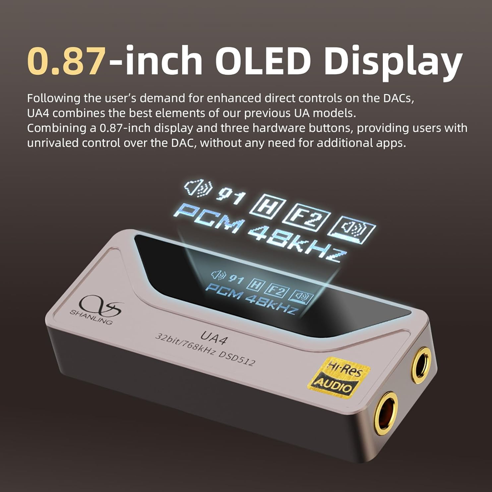 Shanling UA4 — новий флагман серед портативних ЦАПів бренду, що поєднує найкращі рішення попередників і сучасне апаратне забезпечення. Оснащений 32-бітовим DAC-чіпом ESS Sabre ES9069Q, UA4 підтримує відтворення PCM до 768 кГц та DSD512, забезпечуючи високу точність і деталізацію звуку.