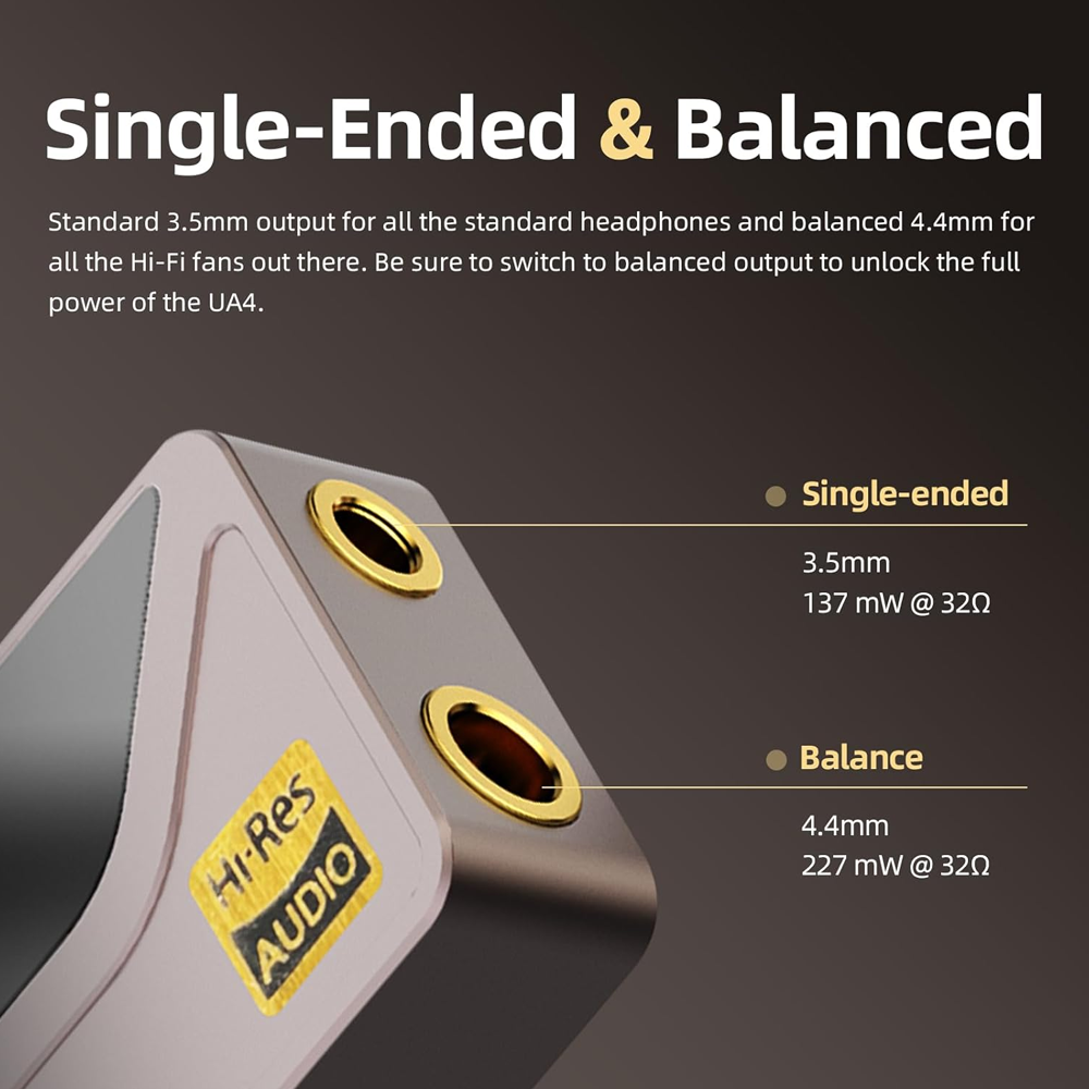 Модель має два виходи — 3.5 мм (несиметричний) і 4.4 мм (балансний), а підсилення здійснюється за допомогою двох мікросхем Ricore RT6863, що видають до 211 мВт при 32 Ом — достатньо для більшості IEM.