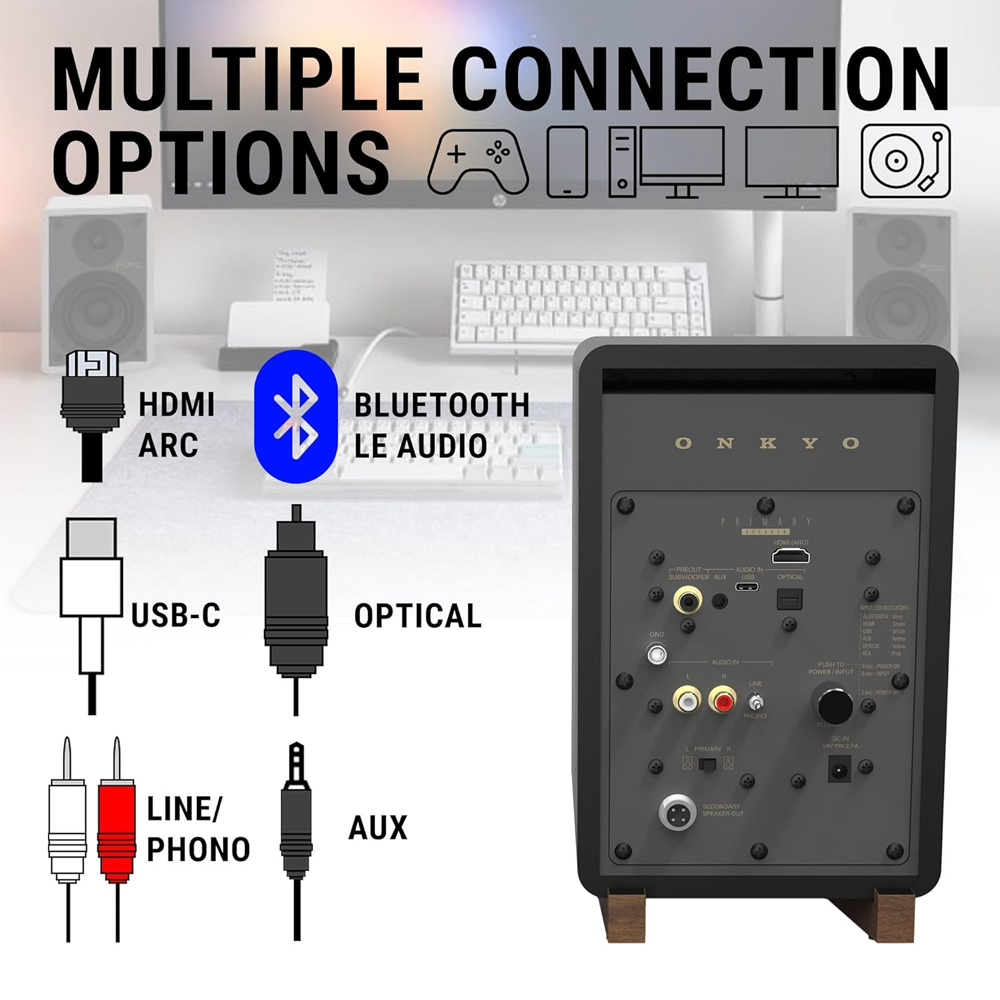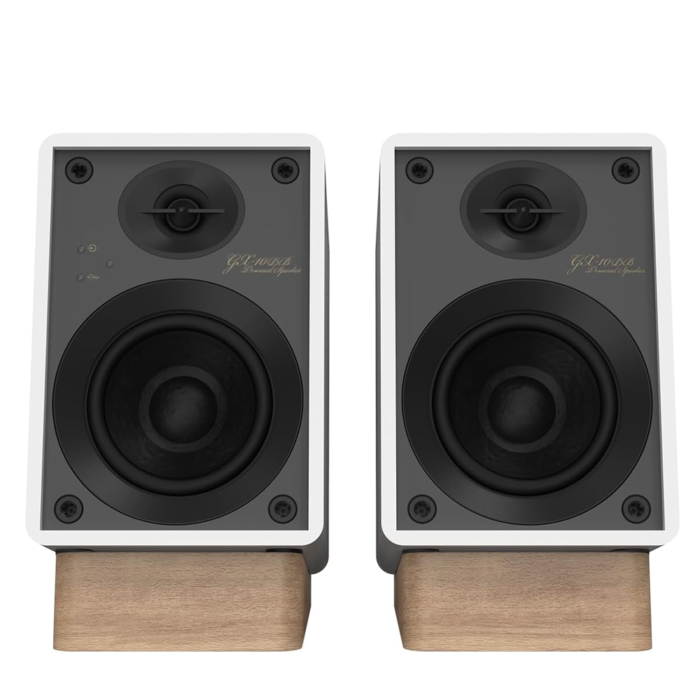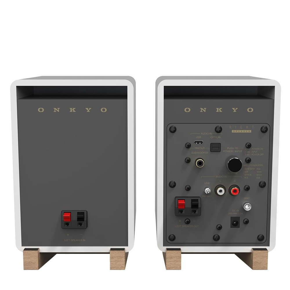 GX-10DB пропонує широкий спектр підключень: USB-C, оптичний вхід, RCA з перемикачем між лінійним і фоно-входом для підключення програвача вінілових платівок, а також Bluetooth 5.3 для бездротового стрімінгу. Крім того, колонки оснащені виходом для підключення сабвуфера, що дозволяє розширити низькі частоти для більш глибокого звучання. В комплекті йдуть підставки з нахилом 10°, пульт дистанційного керування та знімні сітки, що додають елегантності та зручності в експлуатації.