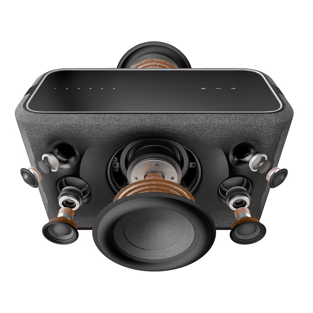 Всередині — трисмугова система з шести динаміків, кожен зі своїм підсилювачем, що забезпечує гучний, рівномірний і насичений звук у всій кімнаті.