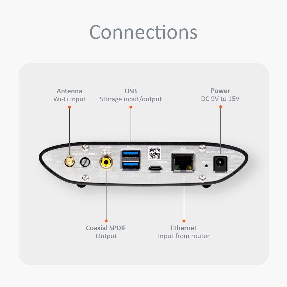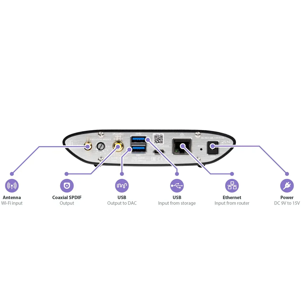 Всередині — високоякісні компоненти, процесор ARM Cortex і фірмовий тактовий генератор GMT для мінімізації джиттеру. Працює з Ethernet або Wi-Fi (802.11 a/b/g/n/ac), підтримує Tidal Connect, Spotify Connect, AirPlay, UPnP і Roon. Керується через додатки iFi, Bubble, MConnect та інші. Zen Stream — просте й ефективне рішення для якісного мережевого стримінгу.