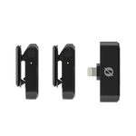 Тип: бездротова мікрофонна система (2 канали) Роз'єм підключення: Lightning Радіус дії: до 100 м (пряма видимість) Спрямованість: всеспрямована Частотний діапазон: 20 Гц – 20 кГц Якість аудіо: 24-біт / 48 кГц Максимальний звуковий тиск: 135 дБ SPL Автономність: до 7 годин (до 21 години з кейсом) Вага: передавач — 12 г, приймач — 6 г