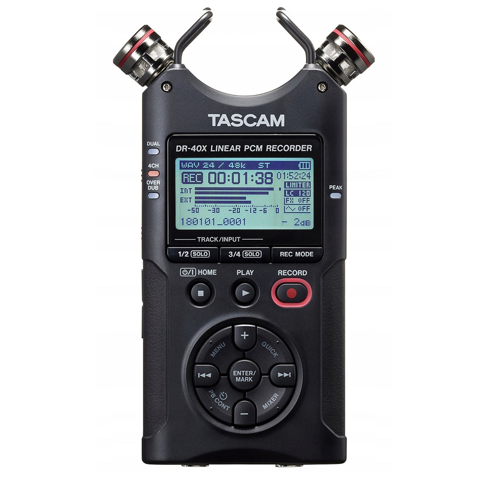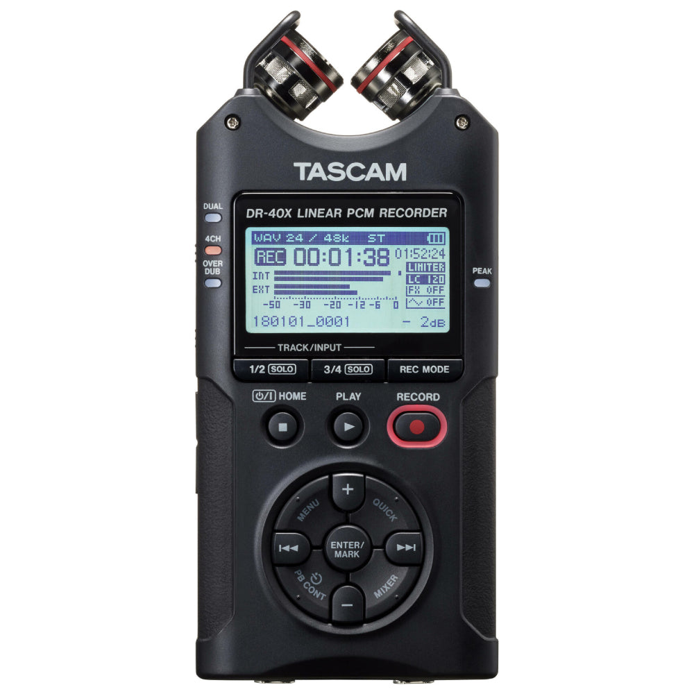 Tascam DR-40X — портативний 4-доріжковий аудіорекордер із вбудованими X/Y-мікрофонами та комбінованими XLR/TRS входами, що дозволяють підключати конденсаторні та динамічні мікрофони. Підтримує запис у форматах WAV (до 24-bit/96 kHz) і MP3, оснащений функціями лімітування, автопідсилення та обрізки шумів, що забезпечує чистий звук у будь-яких умовах.