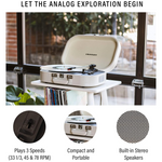 Цей портативний програвач із трьома швидкостями (33 1/3, 45, 78 об/хв) готовий до гри прямо з коробки. Вбудовані стереодинаміки дозволяють просто підключати та грати, є виходи RCA, якщо ви хочете підключити Discovery до ресивера або активних динаміків.