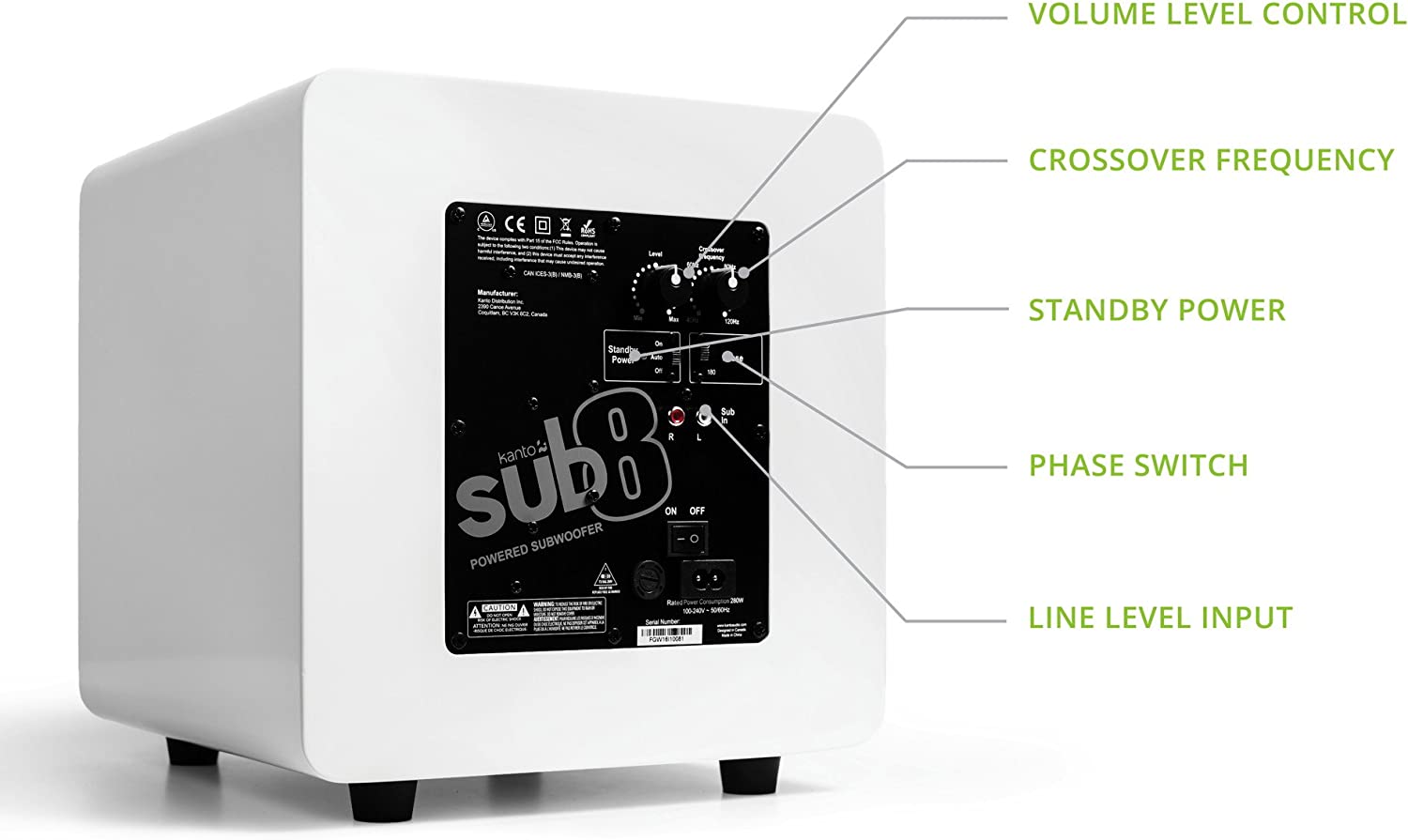 Сабвуфер має регулювання кросовера та фази, що дозволяє точно підлаштувати його під акустику та приміщення. Завдяки компактному корпусу з акуратним дизайном SUB8 легко розмістити навіть у невеликій кімнаті.