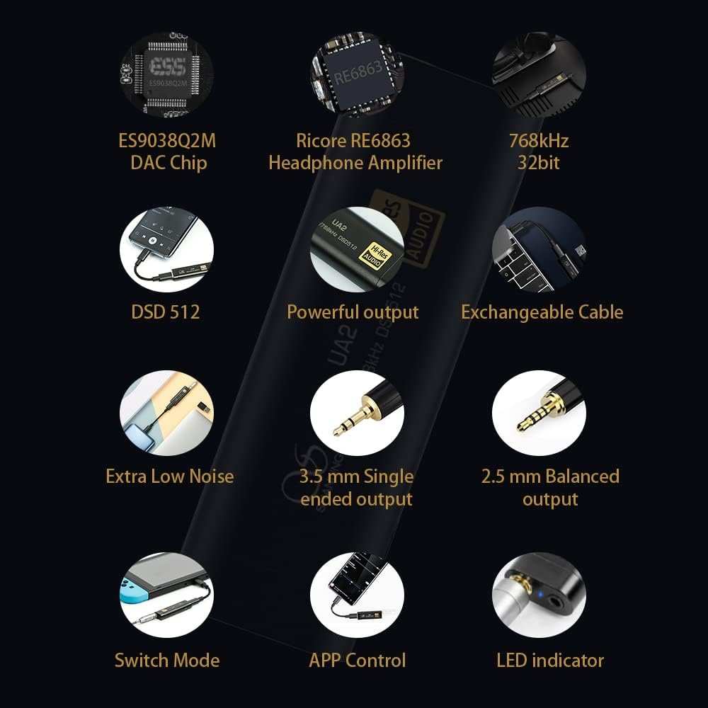 Оснащений топовим ЦАП-чипом ESS ES9038Q2M, UA2 підтримує аудіо до 768 кГц/32 біт та DSD512. Вбудований підсилювач RT6838 забезпечує потужність до 125 мВт (при 32 Ом), гарантуючи чистий звук і високу деталізацію навіть у складних навушниках.