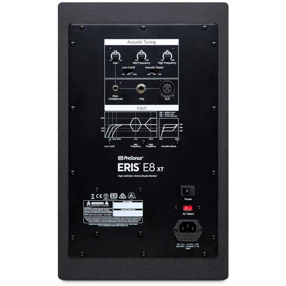 PreSonus Eris E8 XT - двосмуговий активний студійний монітор ближнього поля. Оснащений 8" вуфером з композитного тканинного матеріалу і 1.25" шовковим твітером. Модель оснащена поліпшеним хвилеводом EBM (Elliptical Boundary Modeled). Ця конструкція пропонує ширшу звукову спрямованість ВЧ щодо моделей минулого покоління. Для серії Eris використовуються замовні низькочастотні динаміки з кевлара з ручним плетінням. В якості високочастотного обрано класичний купольний твіттер з шовку, який найбільш природно відтворює перехідні процеси на високих частотах.