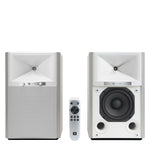 Вбудований регулятор басу допомагає адаптувати звучання до кімнати, а також є вихід на сабвуфер. Колонки можна налаштувати як ліву чи праву, усі елементи керування розміщені на головній колонці. У комплекті — пульт дистанційного керування для зручного керування з будь-якого місця.