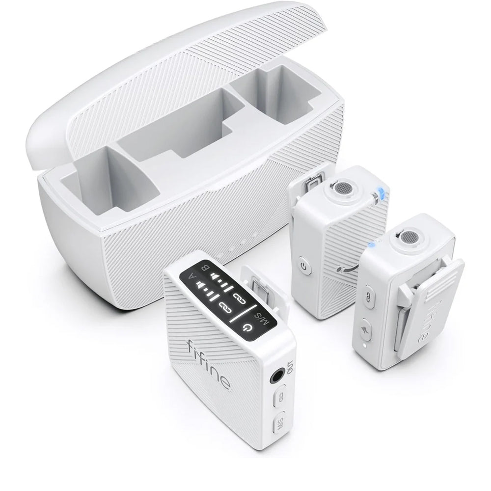 FIFINE M9 — бездротова система з двома петличними мікрофонами, створена для інтерв’ю, стрімів, відеоблогів і мобільних подкастів. У комплект входять два передавачі та приймач, тому можна записувати одразу двох людей без додаткового обладнання. Передавачі компактні, легко кріпляться на одяг і не заважають під час зйомки. Приймач має регулювання гучності для кожного каналу та перемикач режимів Mono/Stereo, що дозволяє адаптувати запис до різних сценаріїв — інтерв’ю, діалог чи зйомка репортажу в русі.