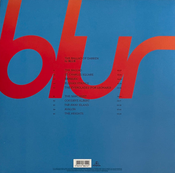 Blur – The Ballad Of Darren [LP] – дев'ятий студійний альбом (2023) британського гурту Blur, представлений у форматі вінілової платівки. Цей альбом є другим після возз'єднання у повному складі. На відміну від експериментальності попередніх робіт, The Ballad Of Darren вирізняється більш інтимним, меланхолійним та рефлексивним звучанням. Це збірка стриманих, але емоційно глибоких пісень, які фокусуються на темах старіння, стосунків та втрат. Композиції, як-от «The Narcissist» та «St. Charles Square», демонструють відмінне поєднання класичної мелодійності Деймона Елбарна та гітарної майстерності Грема Коксона.
