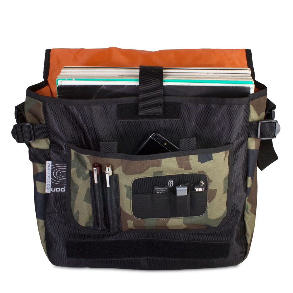 UDG Ultimate CourierBag - Black Camo. Orange inside — міцна сумка-месенджер для діджеїв, продюсерів і саунд-інженерів, що тримає форму та надійно захищає вміст у поїздках між студією та клубом. Місткий основний відсік формату 12" з контрастною помаранчевою підкладкою полегшує пошук речей у темряві: платівки, компактний контролер, навушники чи ноутбук (за потреби). Внутрішні та зовнішні органайзери впорядковують кабелі, носії даних і дрібні аксесуари — усе швидко знаходиться та лишається під рукою.