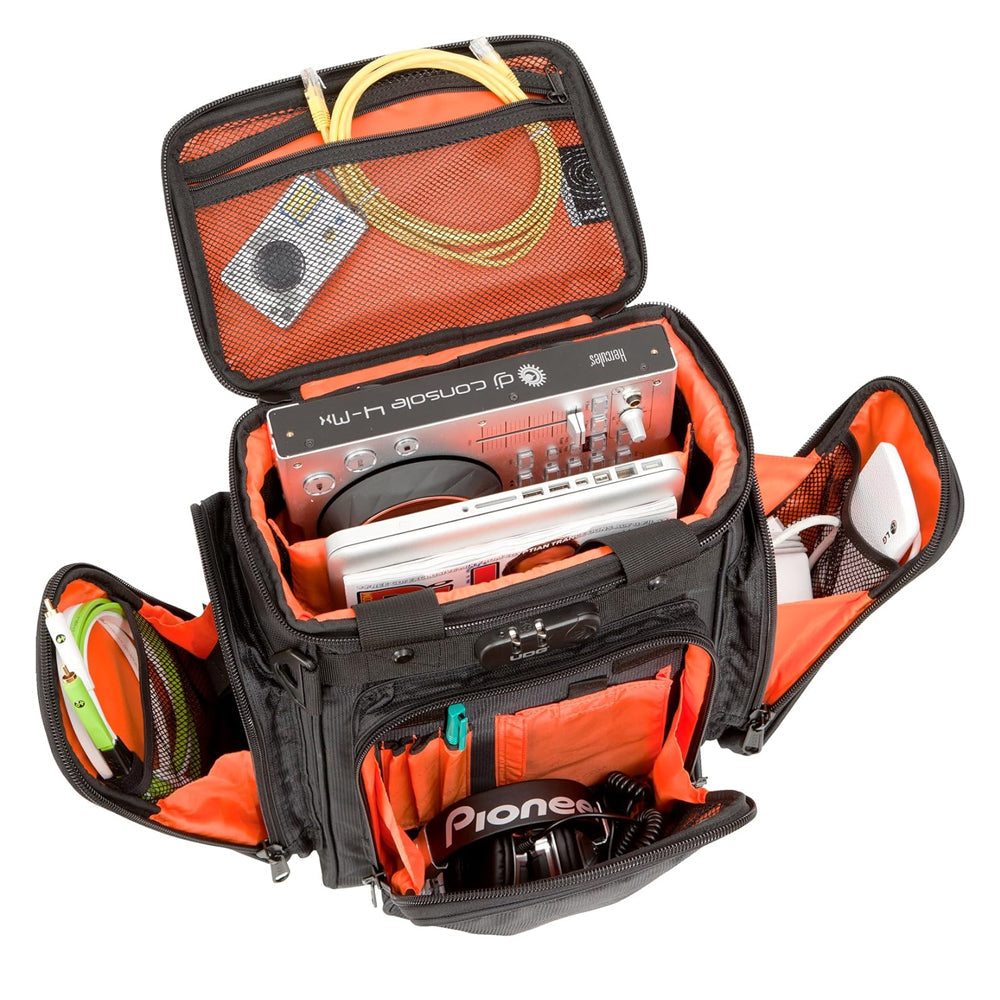 UDG Ultimate ProducerBag Small Black/Orange Inside — компактний рюкзак для продюсерів і діджеїв, розрахований на щоденні поїздки між студією, репетиціями та сетами. Щільний водовідштовхувальний нейлон захищає від дощу й зношування, м’яка підкладка амортизує удари, посилене дно тримає форму, а надійна фурнітура витримує інтенсивне використання. Контрастна помаранчева підкладка допомагає швидко знаходити дрібниці навіть у темряві, зберігаючи порядок у відсіках.