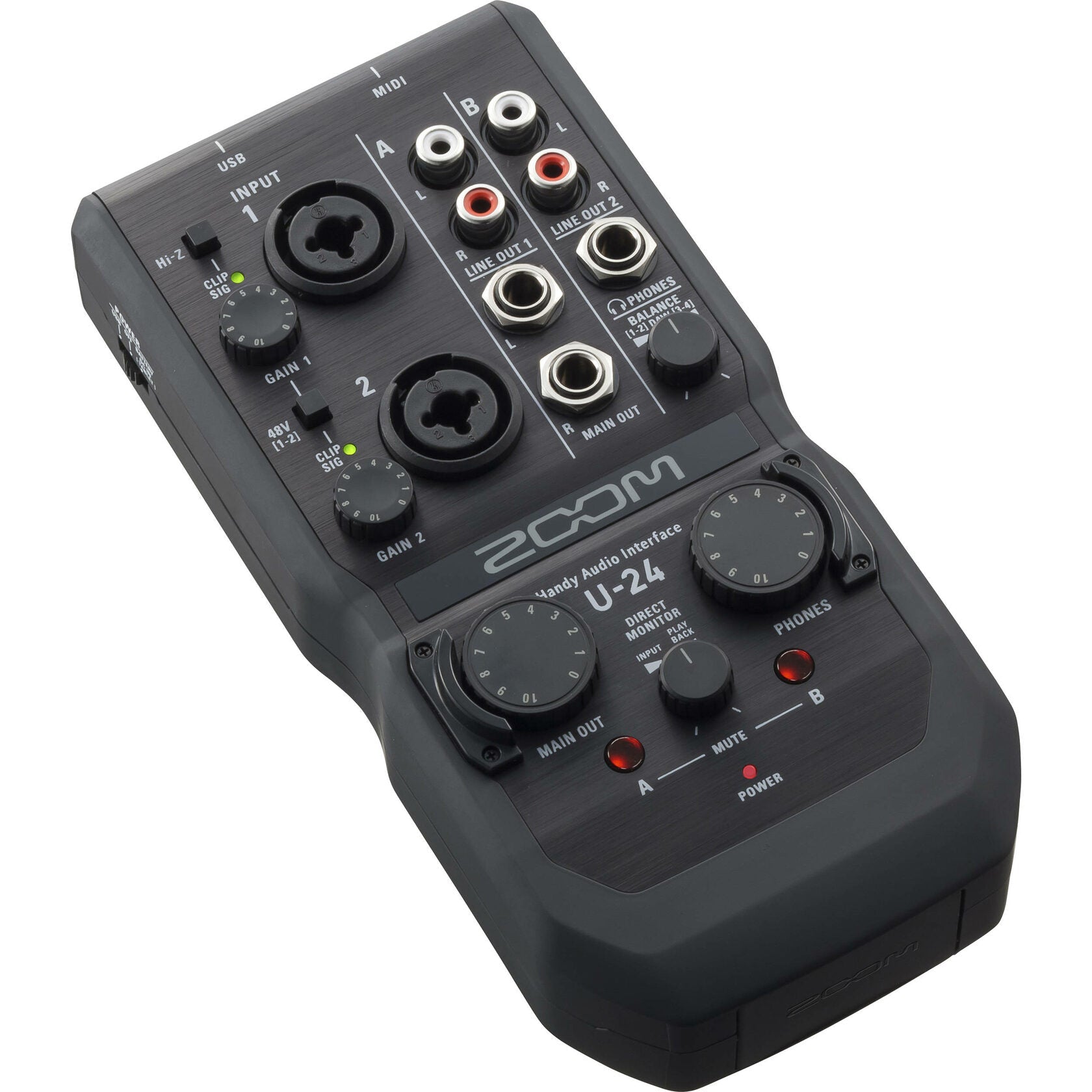 Zoom U-24 — компактний USB-аудіоінтерфейс із 2 входами і 4 виходами, створений для запису високої якості вдома або “в дорозі”. Обидва входи — комбо XLR/TRS з фантомним живленням 48 В, перший вхід має Hi-Z режим, що дозволяє під’єднувати інструменти напряму. Підтримка до 24-bit / 96 kHz забезпечує чистий та детальний звук.