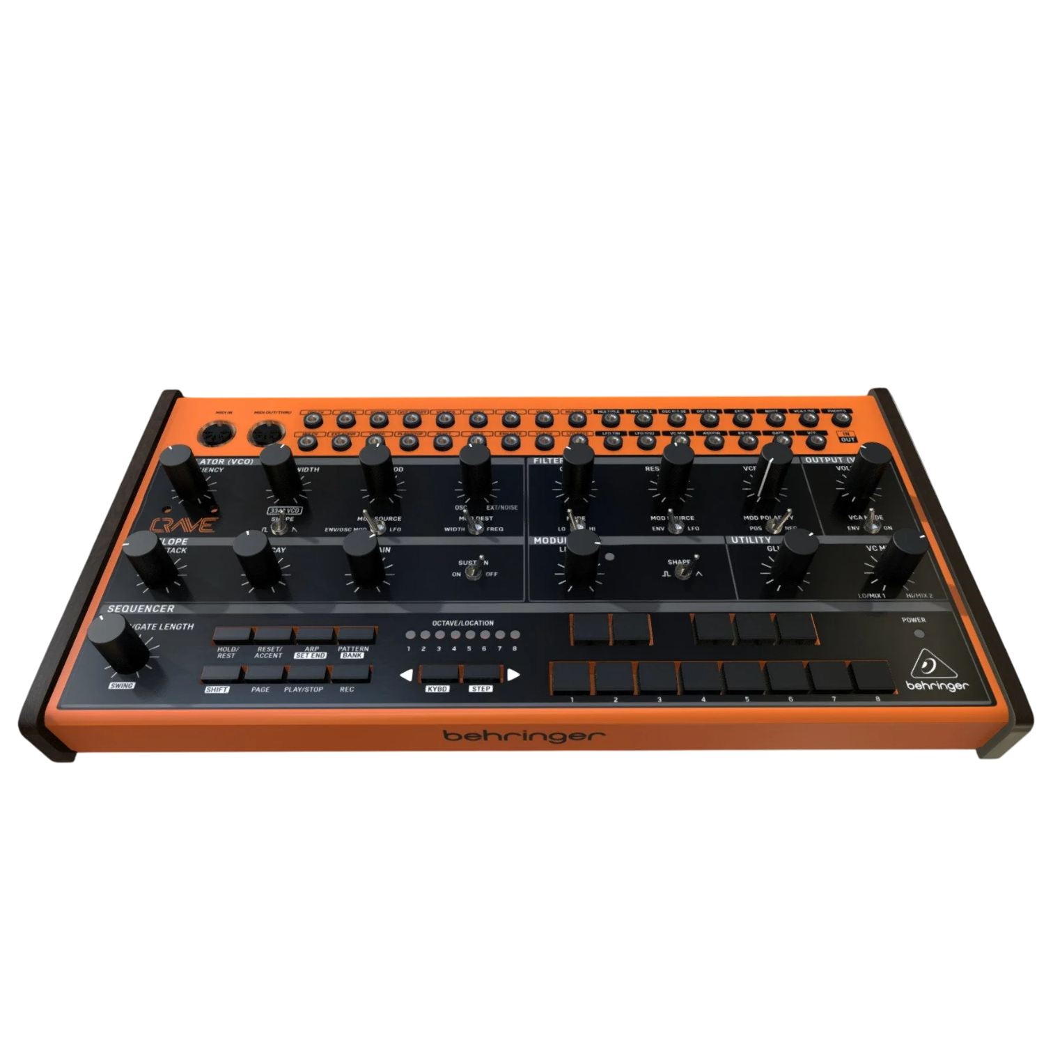 Behringer Crave — доступний і повністю аналоговий напівмодульний синтезатор, що поєднує один з кращих аналогових осциляторів 3340, такий же, як у Sequential Prophet 5 та Neutron, з класичним фільтром Moog Ladder на 24 дБ. Синтезатор оснащений одним генератором огинаючої з регулюванням Attack, Decay і Sustain, при цьому Sustain можна відключати тумблером. Пристрій має потужний 32-кроковий секвенсор із можливістю збереження до 8 доріжок, де на кожному кроці можна регулювати glide time, gate length, accent та ratchet. Для створення акордових патернів доступний вбудований арпеджіатор.