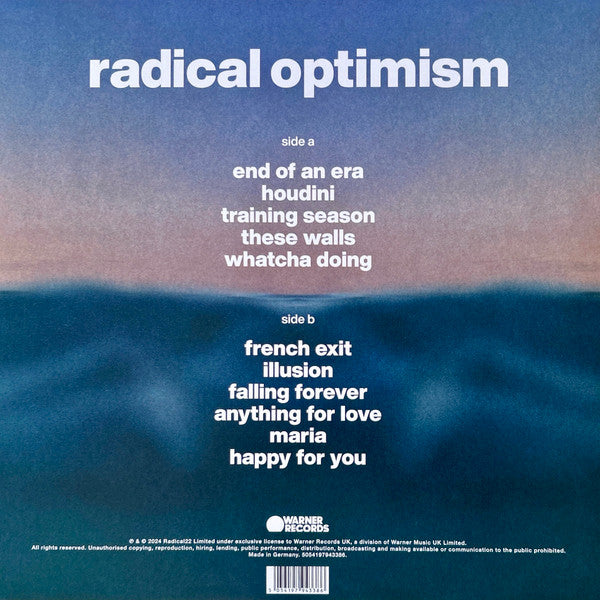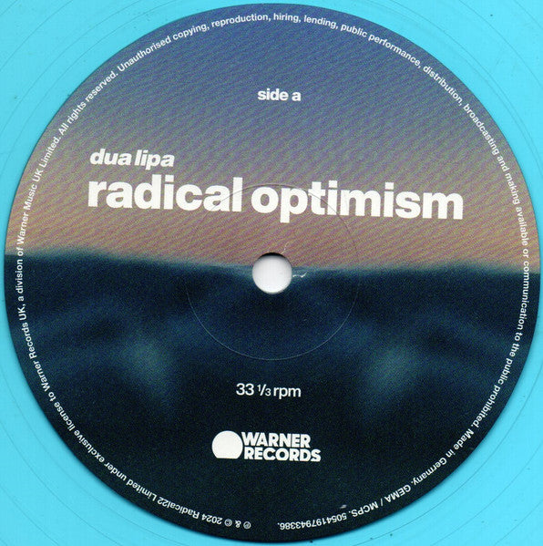 Третій студійний альбом Dua Lipa Radical Optimism, що вийшов у 2024 році. Платівка видана на ексклюзивному Curacao Blue кольоровому вінілі, що привертає увагу та ідеально доповнює візуальний стиль релізу. Музика являє собою вибухове поєднання психоделічного попу, хаусу та денс-попу, з елементами впливу бритпопу 90-х. Альбом включає успішні сингли Houdini, Training Season та Illusion. Цей лонгплей передає атмосферу оптимізму та свободи, характерну для сучасної танцювальної музики. Фірмове динамічне аналогове звучання платівки забезпечує глибокий бас та кришталево чисті синтезатори, які виводять досвід прослуховування на новий рівень. Чудове доповнення до колекції для фанатів Dua Lipa та любителів трендового електро-попу.