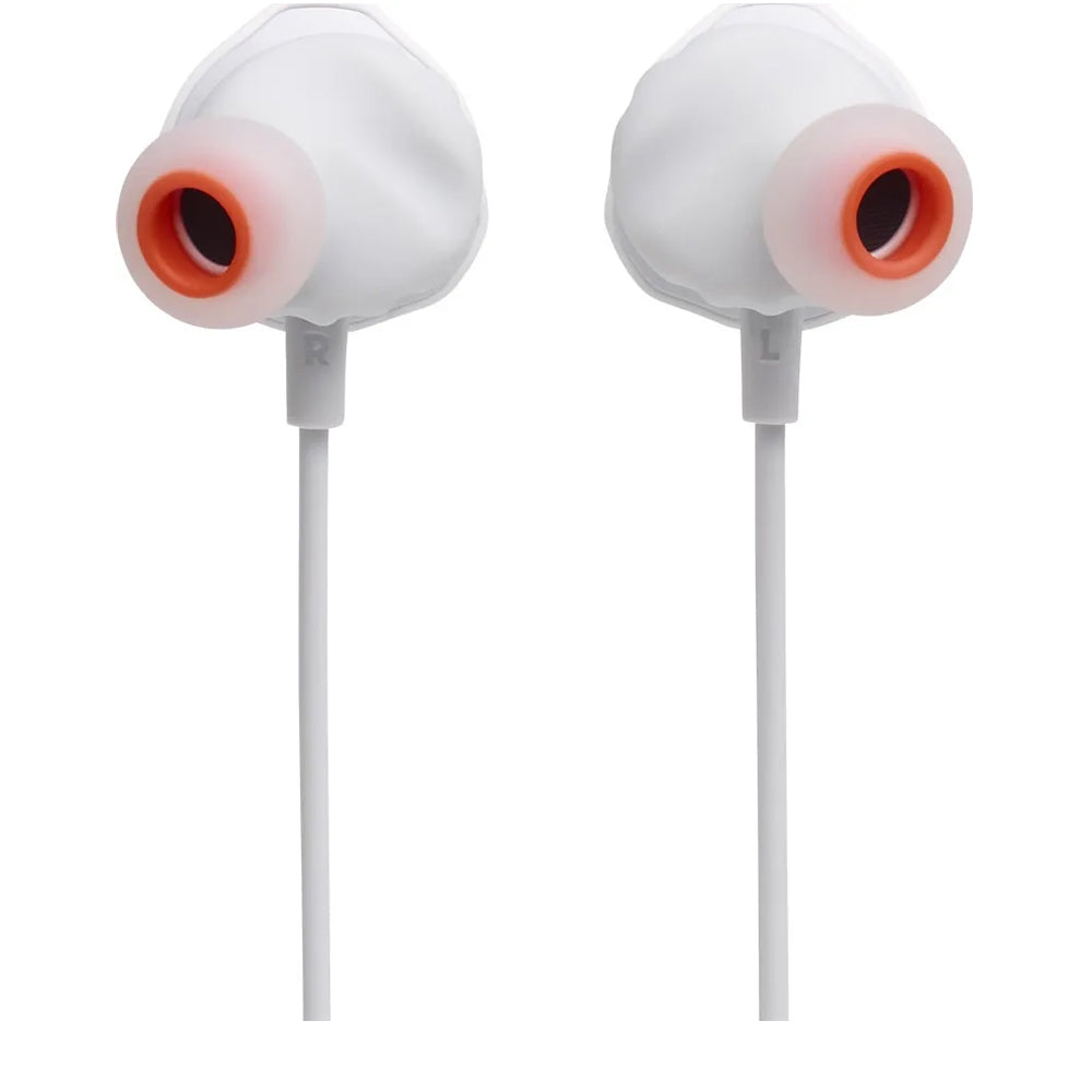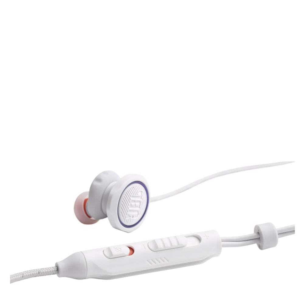 JBL Quantum 50C White – дротові внутрішньоканальні ігрові навушники з підключенням USB-C, зручні для смартфонів, планшетів і сумісних консолей, дають чіткі підказки по кроках і пострілах та розбірливий голос у чаті, мають мікрофон і багатофункціональну кнопку на кабелі для керування.