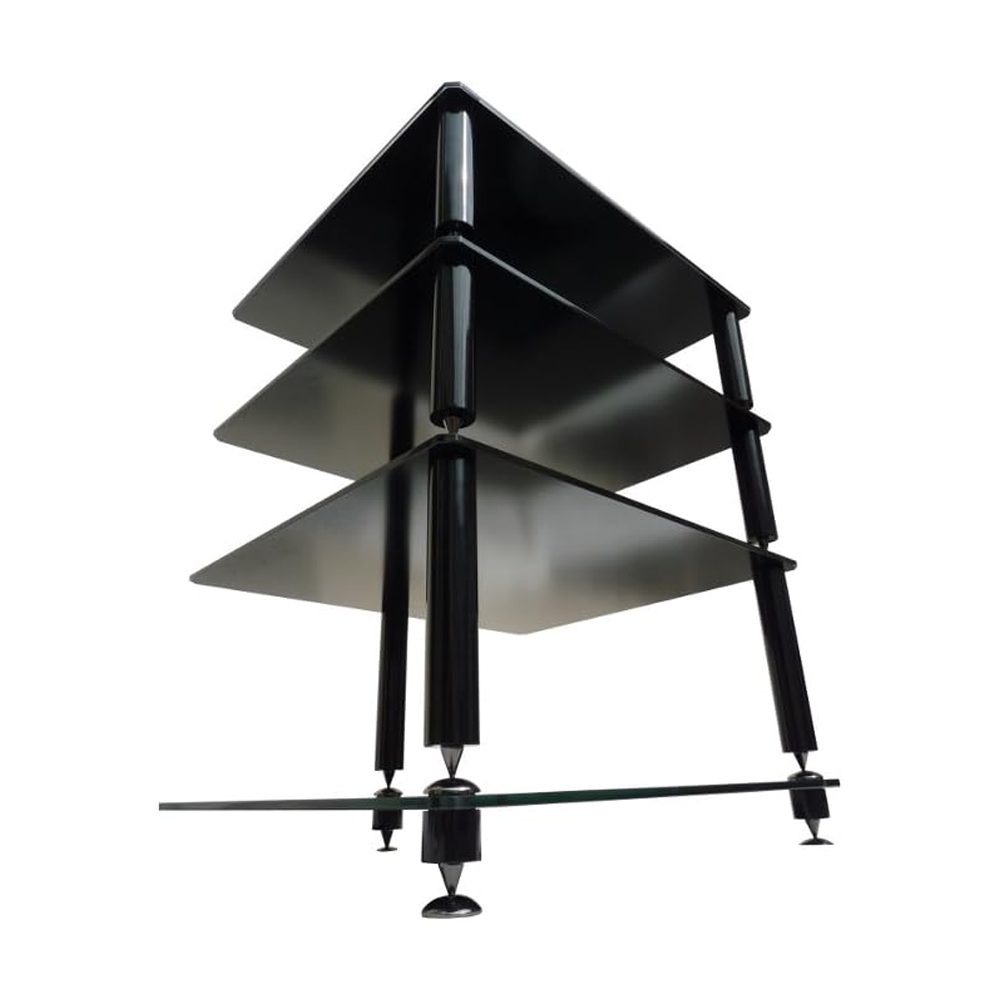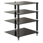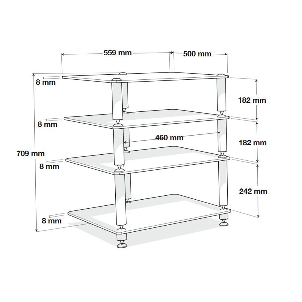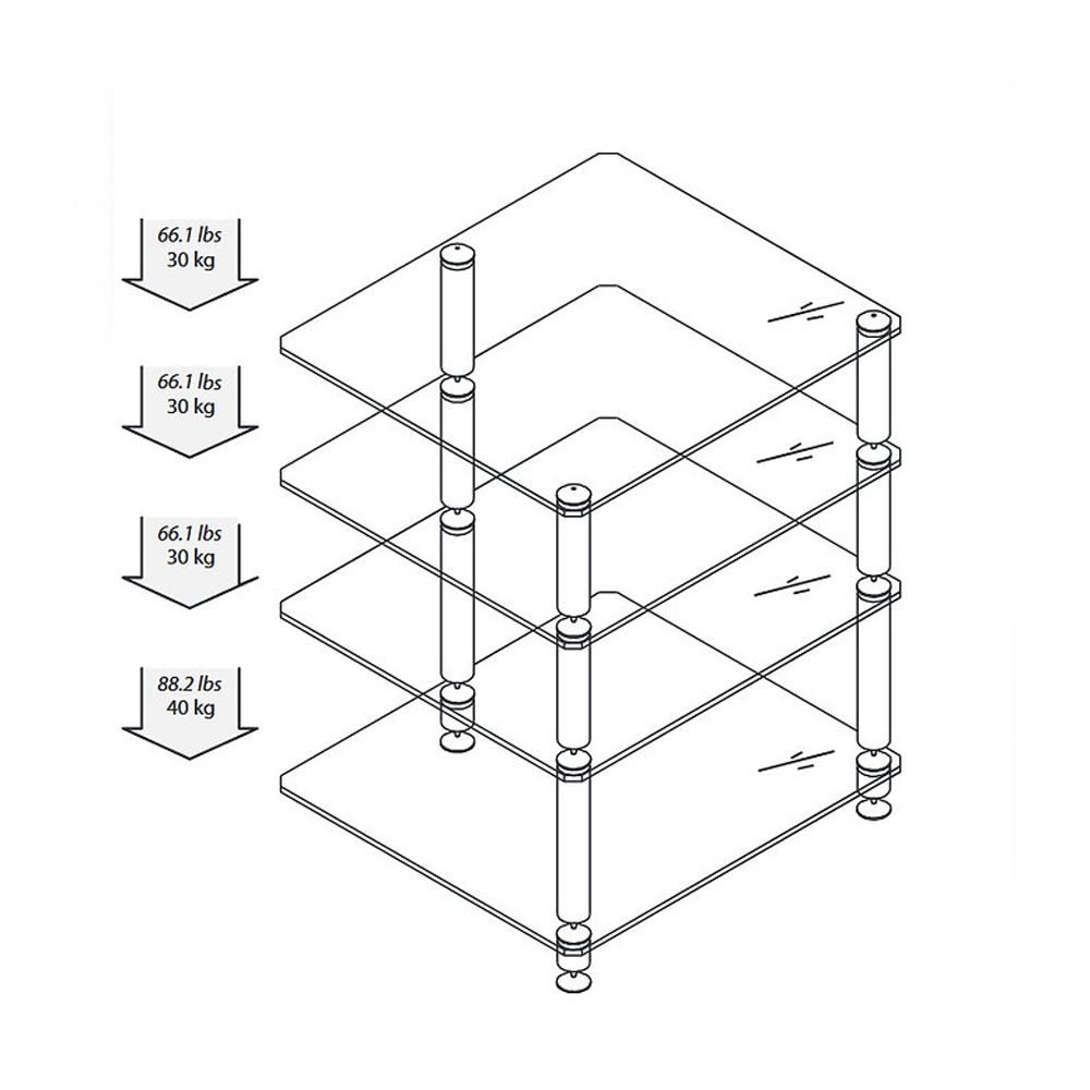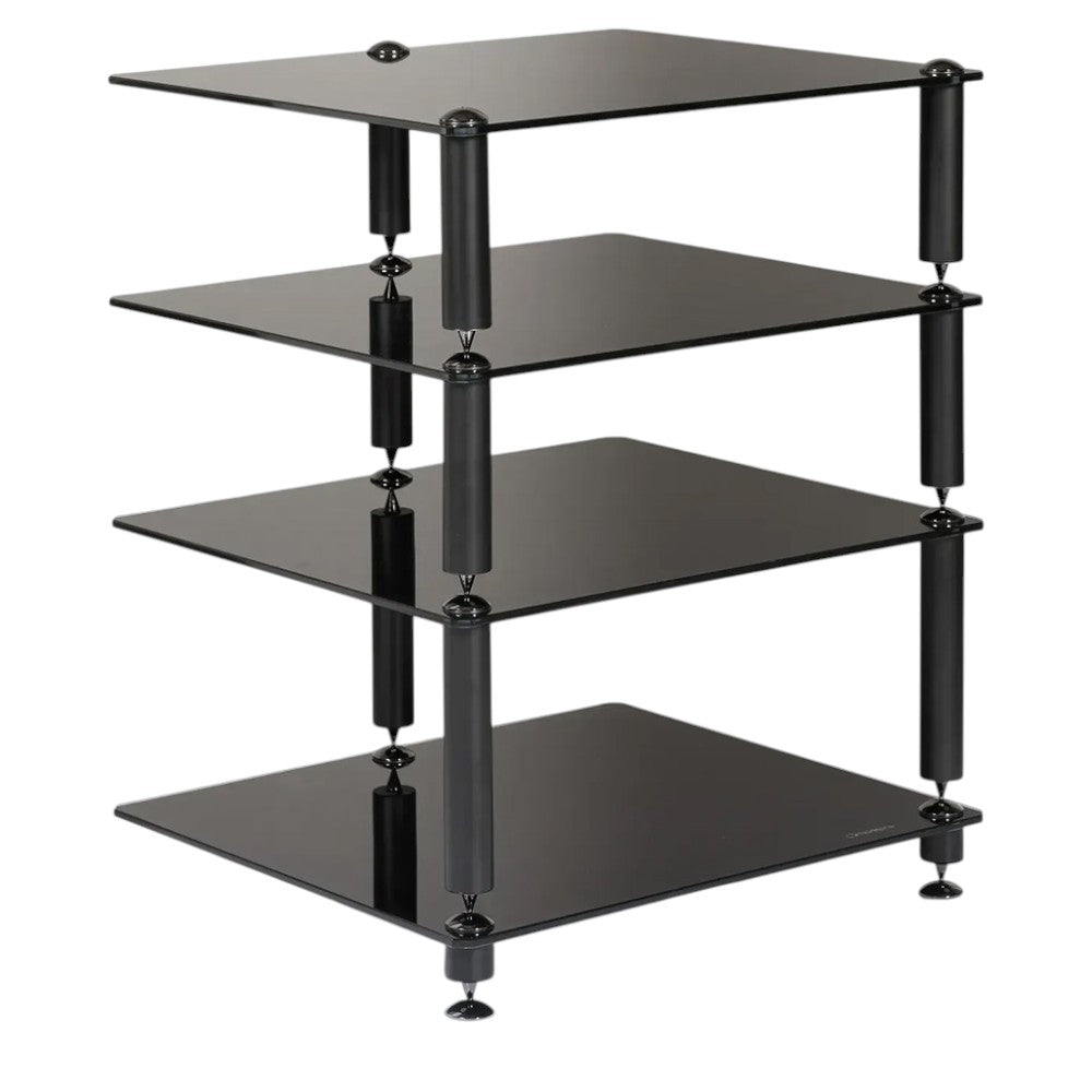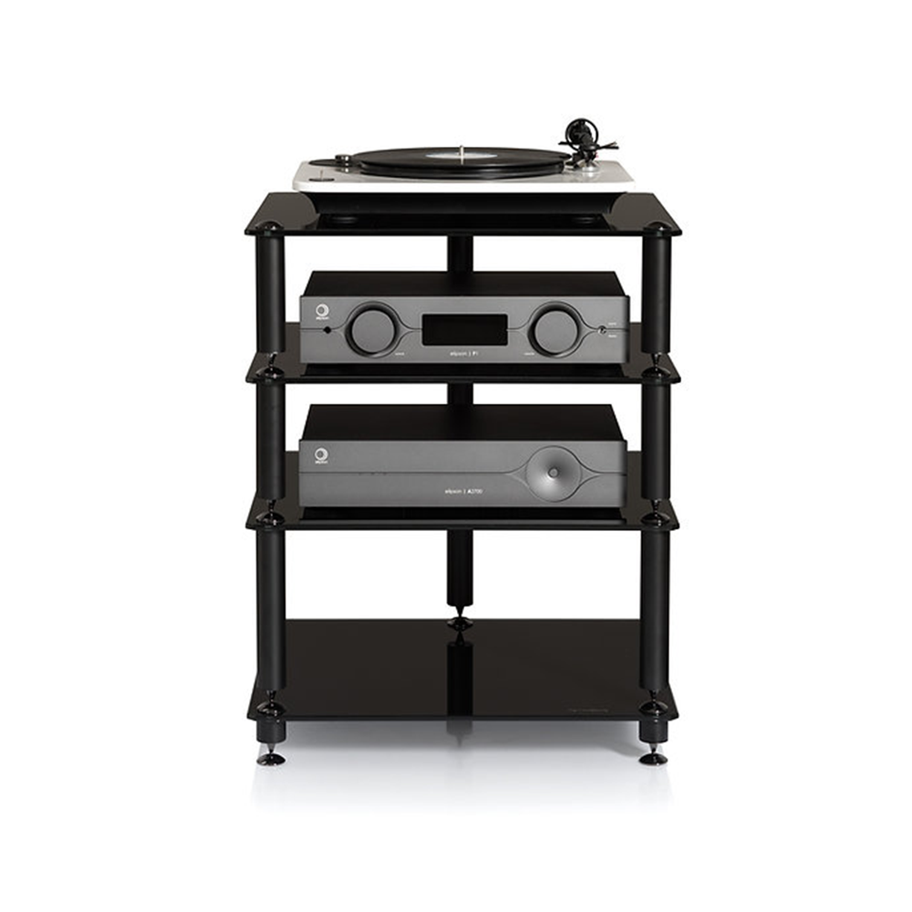 Bergen 2 має чотири полиці, кожна з яких кріпиться між опорами та обладнана власними точками контакту та задніми стійками (tailstocks), що значно підвищує жорсткість конструкції та зменшує вібрації. Верхня полиця розташована на оптимальній висоті для розміщення програвача, а загальний дизайн із глянцевим чорним покриттям та чорним склом підкреслює стильний вигляд